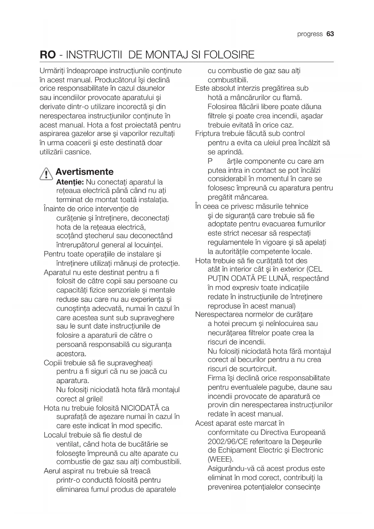 (4.), maximális (5.). Amikor a konyhában különösen nagy a párakoncentráció, használja a nagyobb sebességet. Javasoljuk, hogy főzés előtt 5 perccel kapcsolja be az elszívót, és a főzés befejezése után 15 percig működtesse tovább. Karbantartás Figyelem! Takarítás vagy karbantartás előtt minden esetben kösse ki az elszívót az elektromos hálózatból a villásdugó kihúzása vagy a lakás fő biztosítékának lecsapása révén. Az elszívót gyakran kell tisztítani, mind belülről, mind kívülről (legalább olyan gyakran, mint a zsírszűrő fi lterek tisztítását). A tisztításhoz használjon semleges folyékony mosószerrel átitatott nedves ruhát. Kerülje a súrolószert tartalmazó mosószerek használatát.62 progress NE HASZNÁLJON ALKOHOLT! Figyelem! Az elszívó tisztán tartására, valamint a filterek cseréjére vonatkozó előírások be nem tartása tűzveszélyt okoz. Ezért felhívjuk figyelmét, hogy tartsa be az utasításokat. A helytelen karbantartás, vagy a fent említett utasítások be nem tartása miatt a motorban esetleg bekövetkező károk vagy tűzesetek miatt semmiféle felelősséget nem vállalunk. Zsírszűrő fi lter ábra 1-17 Havonta egyszer nem agresszív tisztítószerrel, kézzel vagy mosogatógépben, alacsony hőfokon és rövid ciklussal el kell mosogatni. Mosogatógépben történő mosogatás a zsírszűrő elszíneződését okozhatja, de ez nem változtat hatékonyságán. Szénfi lter (csak keringtetett változat esetén) ábra 16 Type 20 LONG LIFE - Mosható aktív szénfi lter. A szénfi ltert kéthavonta lehet elmosni meleg vízben és megfelelő mosószerrel, vagy mosogatógépben 65 °C-on (mosogatógépben történő mosás esetén teljes mosogatási ciklust végezzen, edények nélkül). A felesleges vizet a fi lter megrongálása nélkül távolítsa el, majd vegye ki a műanyag keret belsejében található matracszerű betétet és végleges szárítás céljából 10 percre tegye a sütőbe 100 °C-on. A matracszerű betétet 3 évenként, valamint károsodása esetén ki kell cserélni. Type 15 - NEM Mosható aktív szénfi lter. A szénfi lter telítődése többé vagy kevésbé hosszú idő alatt történik meg, a tűzhely típusától és a zsírszűrő tisztogatásának rendszerességétől függően. Mindenképpen cserélni kell a betétet legalább négyhavonként. NEM lehet kimosni vagy regenerálni Égőcsere ábra 18 Bármilyen karbantartási munka megkezdése előtt szüntesse meg az elszívó áramellátását, kösse ki a hálózatból. Figyelem! Mielőtt a lámpákhoz érne, győződjön meg róla, hidegek-e. Csak 12V - 20W max - G4 halogén égőket használjon, vigyázzon arra, hogy kézzel ne érjen hozzájuk.progress 63 RO - INSTRUCTII DE MONTAJ SI FOLOSIRE Urmăriţi îndeaproape instrucţiunile conţinute în acest manual. Producătorul îşi declină orice responsabilitate în cazul daunelor sau incendiilor provocate aparatului şi derivate dintr-o utilizare incorectă şi din nerespectarea instrucţiunilor conţinute în acest manual. Hota a fost proiectată pentru aspirarea gazelor arse şi vaporilor rezultaţi în urma coacerii şi este destinată doar utilizării casnice. Avertismente Atenţie: Nu conectaţi aparatul la reţeaua electrică până când nu aţi terminat de montat toată instalaţia. Înainte de orice intervenţie de curăţenie şi întreţinere, deconectaţi hota de la reţeaua electrică, scoţând ştecherul sau deconectând întrerupătorul general al locuinţei. Pentru toate operaţiile de instalare și întreţinere utilizaţi mănuși de protecţie. Aparatul nu este destinat pentru a fi folosit de către copii sau persoane cu capacităţi fizice senzoriale şi mentale reduse sau care nu au experienţa şi cunoştinţa adecvată, numai în cazul în care acestea sunt sub supraveghere sau le sunt date instrucţiunile de folosire a aparaturii de către o persoană responsabilă cu siguranţa acestora. Copiii trebuie să fie supravegheaţi pentru a fi siguri că nu se joacă cu aparatura. Nu folosiţi niciodată hota fără montajul corect al grilei! Hota nu trebuie folosită NICIODATĂ ca suprafaţă de aşezare numai în cazul în care este indicat în mod specific. Localul trebuie să fie destul de ventilat, când hota de bucătărie se foloseşte împreună cu alte aparate cu combustie de gaz sau alţi combustibili. Aerul aspirat nu trebuie să treacă printr-o conductă folosită pentru eliminarea fumul produs de aparatele cu combustie de gaz sau alţi combustibili. Este absolut interzis pregătirea sub hotă a mâncărurilor cu flamă. Folosirea flăcării libere poate dăuna filtrele şi poate crea incendii, aşadar trebuie evitată în orice caz. Friptura trebuie făcută sub control pentru a evita ca uleiul prea încălzit să se aprindă. Părţile componente cu care am putea intra in contact se pot încălzi considerabil în momentul în care se folosesc împreună cu aparatura pentru pregătit mâncarea. În ceea ce privesc măsurile tehnice şi de siguranţă care trebuie să fie adoptate pentru evacuarea fumurilor este strict necesar să respectaţi regulamentele în vigoare şi să apelaţi la autorităţile competente locale. Hota trebuie să fie curăţată tot des atât în interior cât şi în exterior (CEL PUŢIN ODATĂ PE LUNĂ, respectând în mod expresiv toate indicaţiile redate în instrucţiunile de întreţinere reproduse în acest manual) Nerespectarea normelor de curăţare a hotei precum şi neînlocuirea sau necurăţarea filtrelor poate crea la riscuri de incendii. Nu folosiţi niciodată hota fără montajul corect al becurilor pentru a nu crea riscuri de scurtcircuit. Firma îşi declină orice responsabilitate pentru eventualele pagube, daune sau incendii provocate de aparatură ce provin din nerespectarea instrucţiunilor redate în acest manual. Acest aparat este marcat în conformitate cu Directiva Europeană
