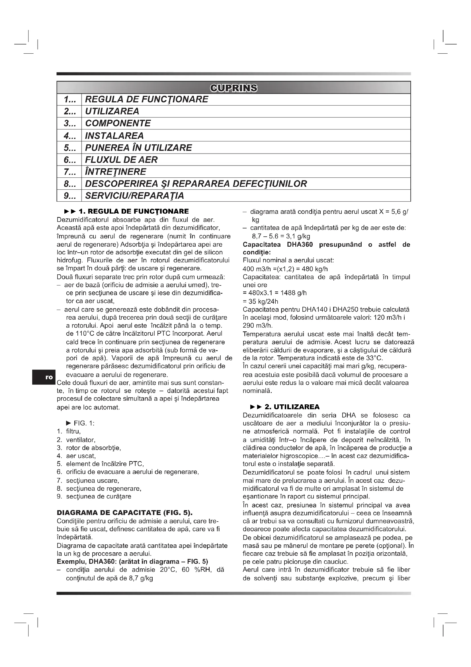 – cantitatea de apă îndepărtată per kg de aer este de: 8,7 – 5.6 = 3,1 g/kg Capacitatea DHA360 presupunând o astfel de condiţie: Fluxul nominal a aerului uscat: 400 m3/h =(x1,2) = 480 kg/h Capacitatea: cantitatea de apă îndepărtată în timpul unei ore = 480x3.1 = 1488 g/h = 35 kg/24h Capacitatea pentru DHA140 i DHA250 trebuie calculată în acelaşi mod, folosind următoarele valori: 120 m3/h i 290 m3/h. Temperatura aerului uscat este mai înaltă decât tem- peratura aerului de admisie. Acest lucru se datorează eliberării căldurii de evaporare, şi a câştigului de căldură de la rotor. Temperatura indicată este de 33°C. În cazul cererii unei capacităţi mai mari g/kg, recupera- rea acestuia este posibilă dacă volumul de procesare a aerului este redus la o valoare mai mică decât valoarea nominală. ► 2. UTILIZAREA Dezumidicatoarele din seria DHA se folosesc ca uscătoare de aer a mediului înconjurător la o presiu- ne atmosferică normală. Pot instalaţiile de control a umidităţi într–o încăpere de depozit neîncălzită, în clădirea conductelor de apă, în încăperea de producţie a materialelor higroscopice....– în acest caz dezumidica- torul este o instalaţie separată. Dezumidicatorul se poate folosi în cadrul unui sistem mai mare de prelucrarea a aerului. În acest caz dezu- midicatorul va de multe ori amplasat în sistemul de eşantionare în raport cu sistemul principal. În acest caz, presiunea în sistemul principal va avea inuenţă asupra dezumidicatorului – ceea ce înseamnă că ar trebui sa va consultati cu furnizorul dumneavoastră, deoarece poate afecta capacitatea dezumidicatorului. De obicei dezumidicatorul se amplasează pe podea, pe masă sau pe mânerul de montare pe perete (opţional). În ecare caz trebuie să e amplasat în poziţia orizontală, pe cele patru picioruşe din cauciuc. Aerul care intră în dezumidicator trebuie să e liber de solvenţi sau substanţe explozive, precum şi liber CUPRINS