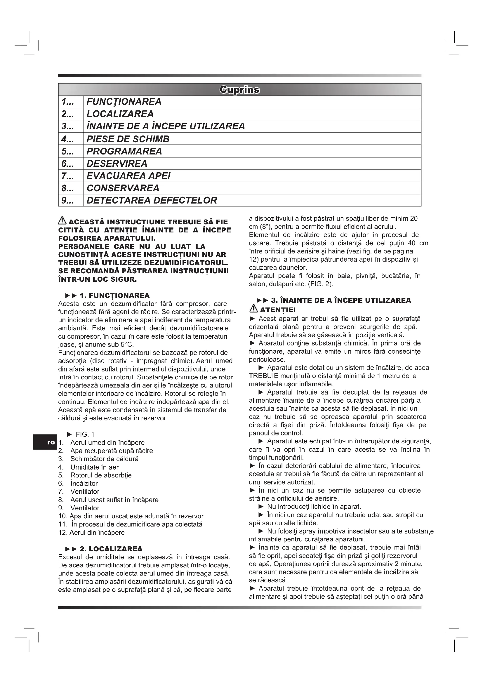 ÎNTR-UN LOC SIGUR. ► 1. FUNCŢIONAREA Acesta este un dezumidicator fără compresor, care funcţionează fără agent de răcire. Se caracterizează printr- un indicator de eliminare a apei indiferent de temperatura ambiantă. Este mai ecient decât dezumidicatoarele cu compresor, în cazul în care este folosit la temperaturi joase, şi anume sub 5°C. Funcţionarea dezumidicatorul se bazează pe rotorul de adsorbţie (disc rotativ - impregnat chimic). Aerul umed din afară este suat prin intermediul dispozitivului, unde intră în contact cu rotorul. Substanţele chimice de pe rotor îndepărtează umezeala din aer şi le încălzeşte cu ajutorul elementelor interioare de încălzire. Rotorul se roteşte în continuu. Elementul de încălzire îndepărtează apa din el. Această apă este condensată în sistemul de transfer de căldură şi este evacuată în rezervor. ► FIG. 1