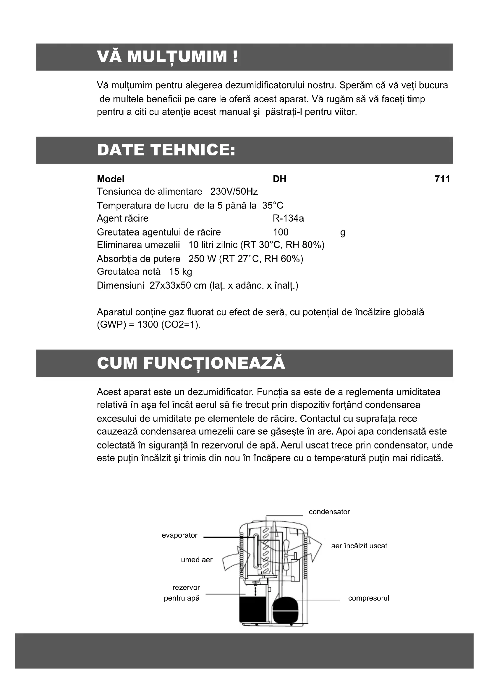 =1) Urządzenie zawiera fluorowany gaz cieplarniany, jego wspóáczynnik ocieplenia globalnego wynosi (GWP) = 1300 aer încălzit uscatcompresorulcondensatorrezervor pentru apăumed aerevaporator VĂ MULŢUMIM ! Vă mulţumim pentru alegerea dezumidifi catorului nostru. Sperăm că vă veţi bucura de multele benefi cii pe care le oferă acest aparat. Vă rugăm să vă faceţi timp pentru a citi cu atenţie acest manual şi păstraţi-l pentru viitor. DATE TEHNICE: Model DH 711 Tensiunea de alimentare 230V/50Hz Temperatura de lucru de la 5 până la 35°C Agent răcire R-134a Greutatea agentului de răcire 100 g Eliminarea umezelii 10 litri zilnic (RT 30°C, RH 80%) Absorbţia de putere 250 W (RT 27°C, RH 60%) Greutatea netă 15 kg Dimensiuni 27x33x50 cm (laţ. x adânc. x înalţ.) Aparatul conţine gaz fl uorat cu efect de seră, cu potenţial de încălzire globală (GWP) = 1300 (CO2=1).