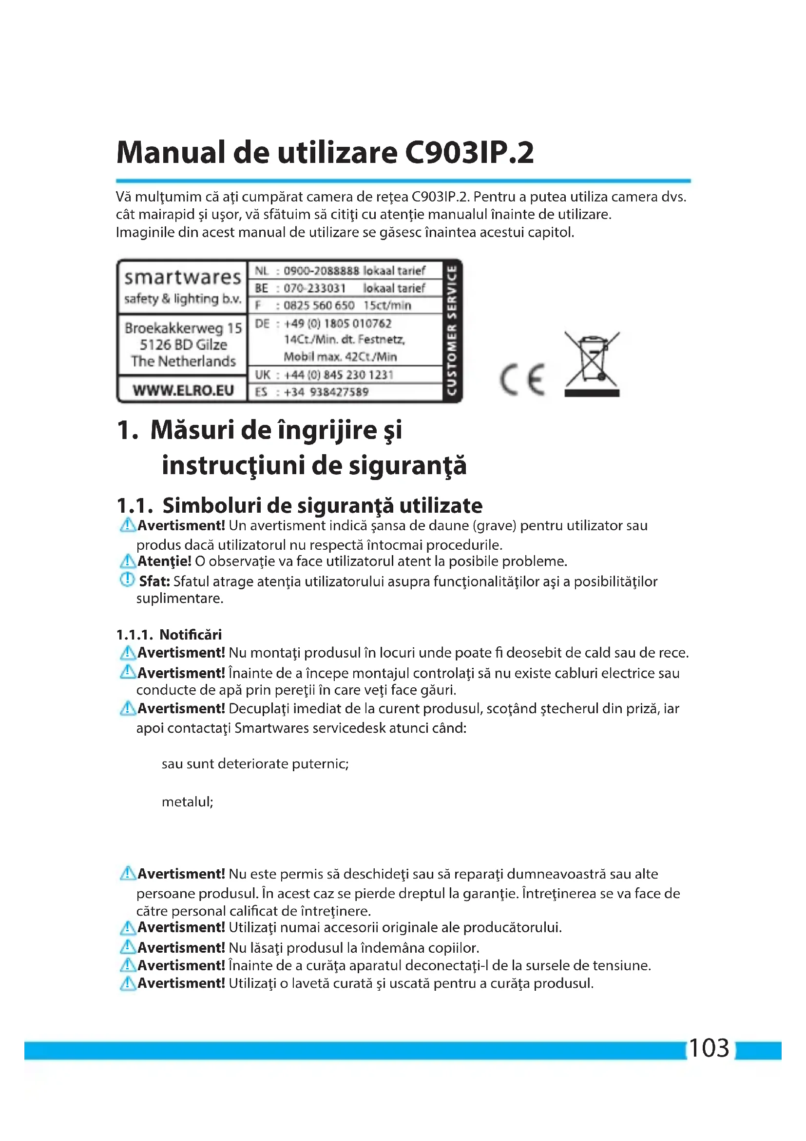 Erre a készülékre határozott idejű, 3 éves garancia érvényes. A garanciális feltételeket itt találja: www.elro.eu.103 Manual de utilizare C903IP.2 Vă mulţumim că aţi cumpărat camera de reţea C903IP.2. Pentru a putea utiliza camera dvs. cât mairapid şi uşor, vă sfătuim să citiţi cu atenţie manualul înainte de utilizare. Imaginile din acest manual de utilizare se găsesc înaintea acestui capitol.