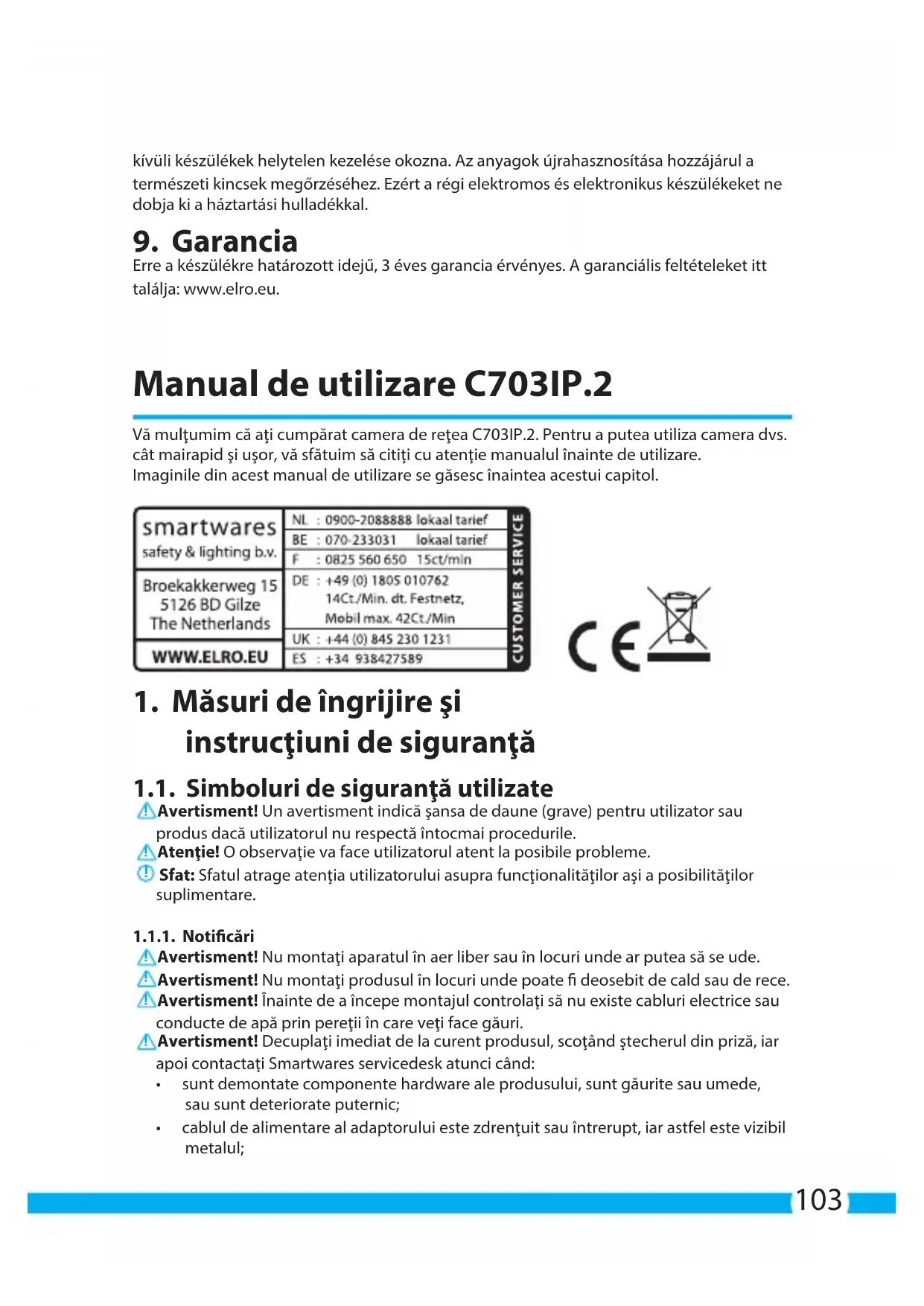 Erre a készülékre határozott idejű, 3 éves garancia érvényes. A garanciális feltételeket itt találja: www.elro.eu. Manual de utilizare C703IP.2 Vă mulţumim că aţi cumpărat camera de reţea C703IP.2. Pentru a putea utiliza camera dvs. cât mairapid şi uşor, vă sfătuim să citiţi cu atenţie manualul înainte de utilizare. Imaginile din acest manual de utilizare se găsesc înaintea acestui capitol.