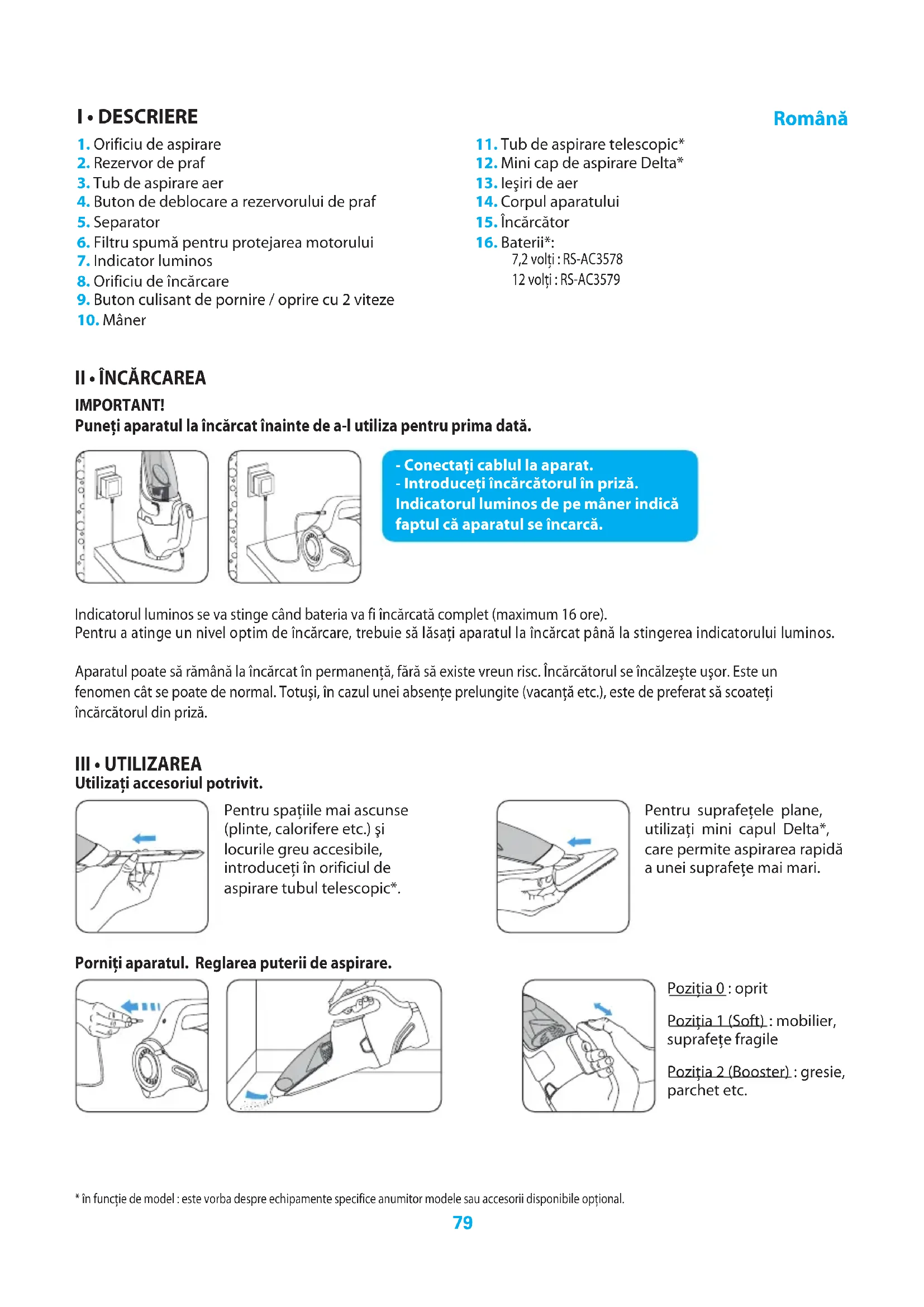 - în funcţie de model : este vorba despre echipamente specifice anumitor modele sau accesorii disponibile opţional. Pentru suprafeţele plane, utilizaţi mini capul Delta*, care permite aspirarea rapidă a unei suprafeţe mai mari. - Conectaţi cablul la aparat. - Introduceţi încărcătorul în priză. Indicatorul luminos de pe mâner indică faptul că aparatul se încarcă. I • DESCRIERE