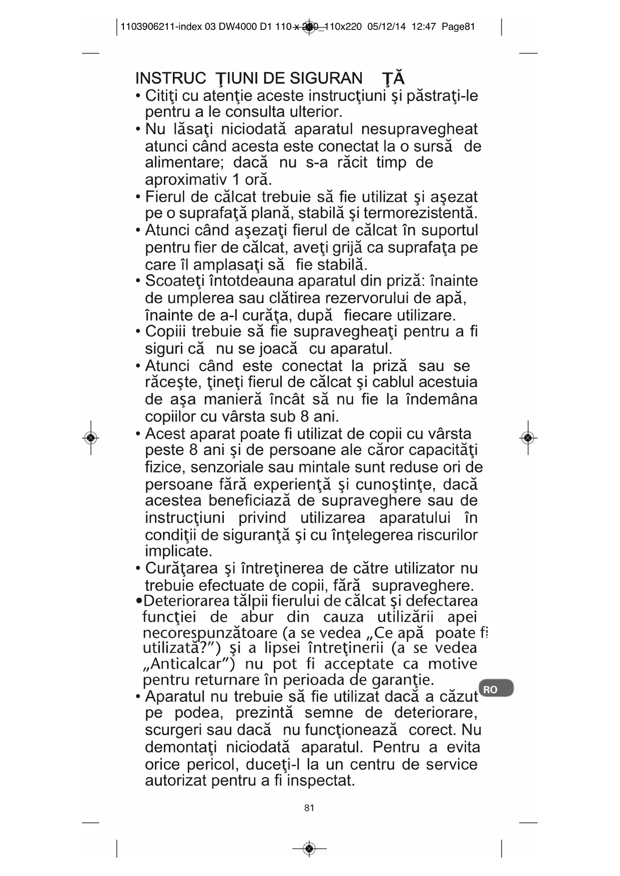 - Ovisno o modelu 1103906211-index 03 DW4000 D1 110 x 220_110x220 05/12/14 12:47 Page82Probleme cu fierul dvs. de cãlcat? Pentru orice altã problemã care necesitã verificarea fierului dvs. de cãlcat, adresa—i-vã unui centru de service autorizat. Mediu Protejati mediul înconjurãtor! i Aparatul dvs. con—ine materiale valorificabile, ce pot fi recuperate sau reciclate. ‹ Preda—i aparatul unui centru de colectare!