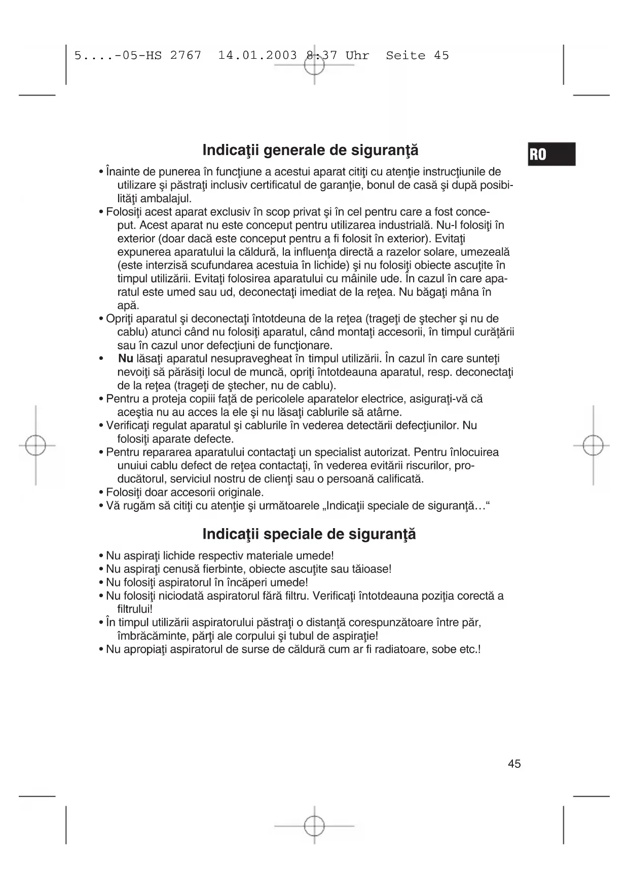 5....-05-HS 2767 14.01.2003 8:37 Uhr Seite 47Garanflie Acordæm pentru aparatul nostru o garanflie de 24 de luni începând cu data achiziflionærii (bon de casæ). Pe durata perioadei de garanflie remediem gratuit defecfliunile aparatului sau ale accesoriilor*) rezultate ca urmare a unor defecfliuni din fabricaflie, reparând sau, în funcflie de aprecierea noastræ, înlocuind aparatul. Reparafliile în garanflie nu duc la prelungirea teremenului de garanflie øi nici la obflinerea unei noi garanflii! Pentru a beneficia de garanflie, cumpærætorul este obligat sæ prezinte chitanfla/factu- ra originalæ de cumpærare a aparatului. Færæ aceastæ dovadæ nu se poate efectua înlocuirea sau reparaflia gratuitæ a aparatului. În cazul remedierilor în garanflie predafli aparatul integral în ambalajul original împreunæ cu bonul de casæ la service-ul autorizat. *) Defecfliunile accesoriilor nu includ în mod automat schimbarea întregului aparat. În acest caz væ rugæm sæ sunafli la unul din numerele noastre de telefon! Deteriorærile componentelor din sticlæ respectiv ale celor din material plastic trebuie plætite! Atât defectele de la accesoriile funcflionale resp. componetele care se uzeazæ (de ex. paleta de fræmântat, curea de distribuflie, telecomandæ de rezervæ, periufle de dinfli de rezervæ, pânza de fieræstræu) cât øi curæflarea, întreflinerea sau înlocuirea componentelor care se uzeazæ, nu untræ sub incidenfla garanfliei øi de aceea trebuie plætite! Garanflia dispare în cazul intervenfliei stræine. Post-garanflie Dupæ scurgerea teremenului de garanflie reparafliile pot fi efectuate gratuit de cætre service-ul autorizat.