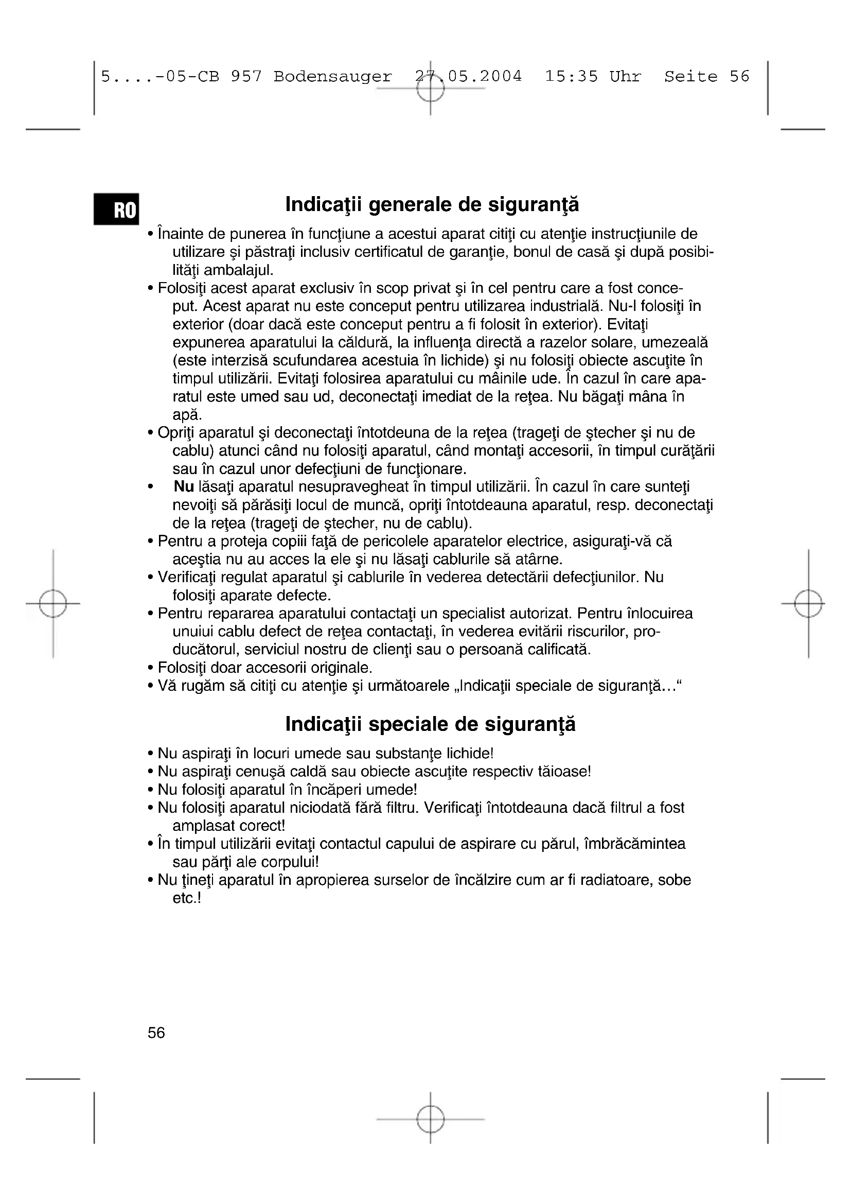 5....-05-CB 957 Bodensauger 27.05.2004 15:35 Uhr Seite 59Garanflie Acordæm pentru aparatul nostru o garanflie de 24 de luni începând cu data achiziflionærii (bon de casæ). Pe durata perioadei de garanflie remediem gratuit defecfliunile aparatului sau ale accesoriilor*) rezultate ca urmare a unor defecfliuni din fabricaflie, reparând sau, în funcflie de aprecierea noastræ, înlocuind aparatul. Reparafliile în garanflie nu duc la prelungirea teremenului de garanflie øi nici la obflinerea unei noi garanflii! Pentru a beneficia de garanflie, cumpærætorul este obligat sæ prezinte chitanfla/factu- ra originalæ de cumpærare a aparatului. Færæ aceastæ dovadæ nu se poate efectua înlocuirea sau reparaflia gratuitæ a aparatului. În cazul remedierilor în garanflie predafli aparatul integral în ambalajul original împreunæ cu bonul de casæ la service-ul autorizat. *) Defecfliunile accesoriilor nu includ în mod automat schimbarea întregului aparat. În acest caz væ rugæm sæ sunafli la unul din numerele noastre de telefon! Deteriorærile componentelor din sticlæ respectiv ale celor din material plastic trebuie plætite! Atât defectele de la accesoriile funcflionale resp. componetele care se uzeazæ (de ex. paleta de fræmântat, curea de distribuflie, telecomandæ de rezervæ, periufle de dinfli de rezervæ, pânza de fieræstræu) cât øi curæflarea, întreflinerea sau înlocuirea componentelor care se uzeazæ, nu untræ sub incidenfla garanfliei øi de aceea trebuie plætite! Garanflia dispare în cazul intervenfliei stræine. Post-garanflie Dupæ scurgerea teremenului de garanflie reparafliile pot fi efectuate gratuit de cætre service-ul autorizat.