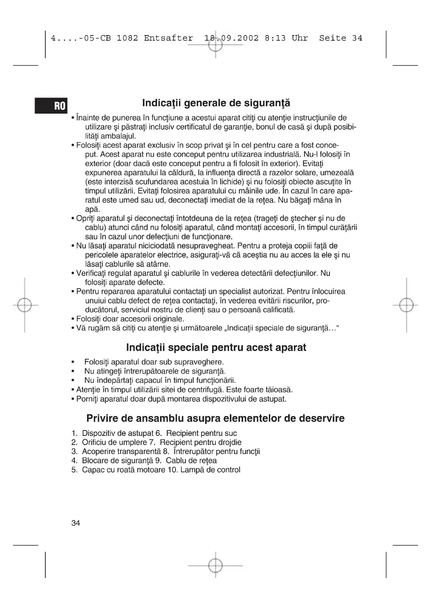 4....-05-CB 1082 Entsafter 18.09.2002 8:13 Uhr Seite 35*) Defecfliunile accesoriilor nu includ în mod automat schimbarea întregului aparat. În acest caz væ rugæm sæ sunafli la unul din numerele noastre de telefon! Deteriorærile componentelor din sticlæ respectiv ale celor din material plastic trebuie plætite! Atât defectele de la accesoriile funcflionale resp. componetele care se uzeazæ (de ex. paleta de fræmântat, curea de distribuflie, telecomandæ de rezervæ, periufle de dinfli de rezervæ, pânza de fieræstræu) cât øi curæflarea, întreflinerea sau înlocuirea componentelor care se uzeazæ, nu untræ sub incidenfla garanfliei øi de aceea trebuie plætite! Garanflia dispare în cazul intervenfliei stræine. Post-garanflie Dupæ scurgerea teremenului de garanflie reparafliile pot fi efectuate gratuit de cætre service-ul autorizat.