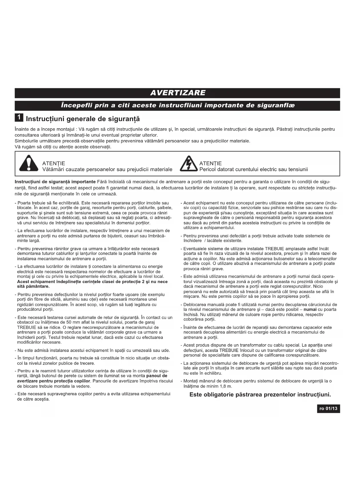 - 37 Declaraţie de conformitate ro 01/13 Instrucţiuni generale de siguranţă Înainte de a începe montajul : Vă rugăm să citiţi instrucţiunile de utilizare şi, în special, următoarele instrucţiuni de siguranţă. Păstraţi instrucţiunile pentru consultarea ulterioară şi înmânaţi-le unui eventual proprietar ulterior.Simbolurile următoare precedă observaţiile pentru prevenirea vătămării persoanelor sau a prejudiciilor materiale. Vă rugăm să citiţi cu atenţie aceste observaţii. Instrucţiuni de siguranţă importante Fără îndoială că mecanismul de antrenare a porţii este conceput pentru a garanta o utilizare în condiţii de sigu- ranţă, fiind astfel testat; acest aspect poate fi garantat numai dacă, la efectuarea lucrărilor de instalare ţi la operare, sunt respectate cu stricteţe instrucţiu- nile de siguranţă menţionate în cele ce urmează. ATENŢIE Vătămări cauzate persoanelor sau prejudicii materiale ATENŢIE Pericol datorat curentului electric sau tensiunii p. 13