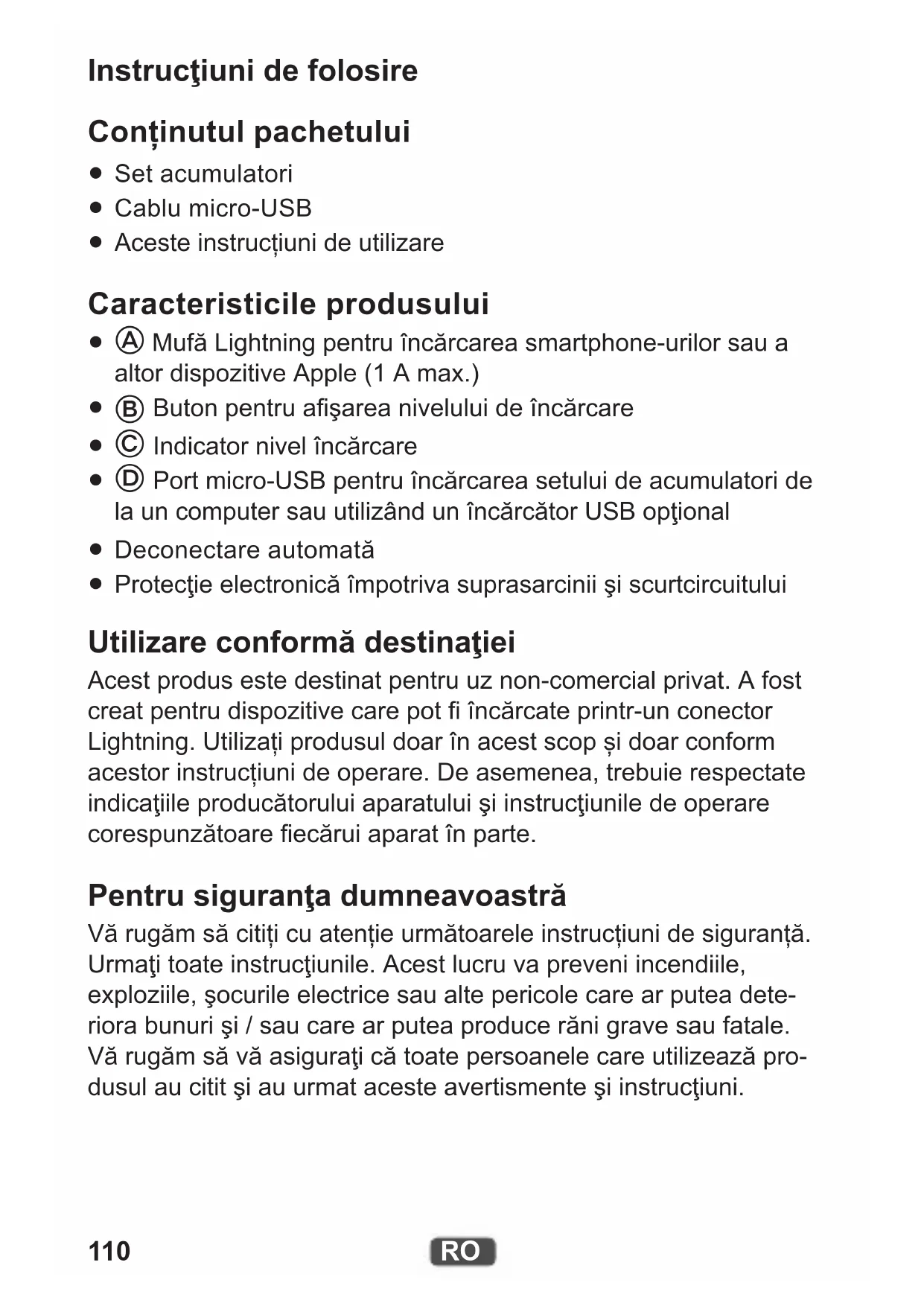 Protecţie electronică împotriva suprasarcinii şi scurtcircuitului Utilizare conformă destinaţiei Acest produs este destinat pentru uz non-comercial privat. A fost creat pentru dispozitive care pot încărcate printr-un conector Lightning. Utilizați produsul doar în acest scop și doar conform acestor instrucțiuni de operare. De asemenea, trebuie respectate indicaţiile producătorului aparatului şi instrucţiunile de operare corespunzătoare ecărui aparat în parte. Pentru siguranţa dumneavoastră Vă rugăm să citiți cu atenție următoarele instrucțiuni de siguranță. Urmaţi toate instrucţiunile. Acest lucru va preveni incendiile, exploziile, şocurile electrice sau alte pericole care ar putea dete- riora bunuri şi / sau care ar putea produce răni grave sau fatale. Vă rugăm să vă asiguraţi că toate persoanele care utilizează pro- dusul au citit şi au urmat aceste avertismente şi instrucţiuni.111