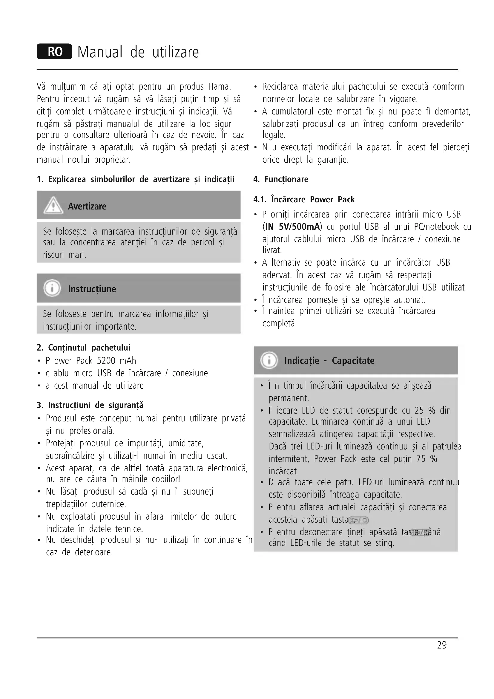 Ochrana životného prostredia: Európska smernica 2012/19/EU a 2006/66/EU stanovuje: Elektrické a elektronické zariadenia, rovnako ako batérie sa nesmú vyhadzovať do domáceho odpadu. Spotrebiteľ je zo zákona povinný zlikvidovať elektrické a elektronické zariadenia, rovnako ako batérie na miesta k tomu určené. Symbolizuje to obrázok v návode na použitie, alebo na balení výrobku. Opätovným zužitkovaním alebo inou formou recyklácie starých zariadení/batérií prispievate k ochrane životného prostredia.29 M Manual de utilizare Vă mulţumim că aţi optat pentru un produs Hama. Pentru început vă rugăm să vă lăsați puțin timp și să citiți complet următoarele instrucțiuni și indicații. Vă rugăm să păstraţi manualul de utilizare la loc sigur pentru o consultare ulterioară în caz de nevoie. În caz de înstrăinare a aparatului vă rugăm să predați și acest manual noului proprietar.