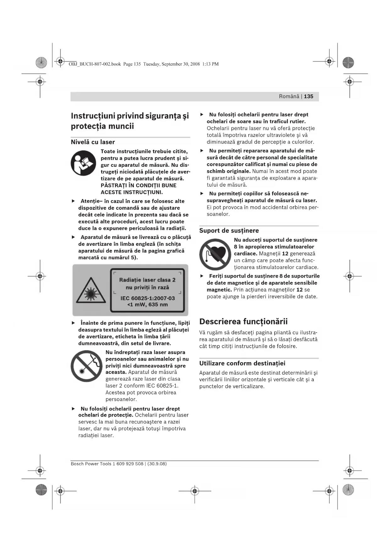 Instrucţiuni privind siguranţa şi protecţia muncii Nivelă cu laser Toate instrucţiunile trebuie citite, pentru a putea lucra prudent şi si- gur cu aparatul de măsură. Nu dis- trugeţi niciodată plăcuţele de aver- tizare de pe aparatul de măsură. PĂSTRAŢI ÎN CONDIŢII BUNE ACESTE INSTRUCŢIUNI. f Atenţie – în cazul în care se folosesc alte dispozitive de comandă sau de ajustare decât cele indicate în prezenta sau dacă se execută alte proceduri, acest lucru poate duce la o expunere periculoasă la radiaţii. f Aparatul de măsură se livrează cu o plăcuţă de avertizare în limba engleză (în schiţa aparatului de măsură de la pagina grafică marcată cu numărul 5). f Înainte de prima punere în funcţiune, lipiţi deasupra textului în limba egleză al plăcuţei de avertizare, eticheta în limba ţării dumneavoastră, din setul de livrare. Nu îndreptaţi raza laser asupra persoanelor sau animalelor şi nu priviţi nici dumneavoastră spre aceasta. Aparatul de măsură generează raze laser din clasa laser 2 conform IEC 60825-1. Acestea pot provoca orbirea persoanelor. f Nu folosiţi ochelarii pentru laser drept ochelari de protecţie. Ochelarii pentru laser servesc la mai buna recunoaştere a razei laser, dar nu vă protejează totuşi împotriva radiaţiei laser. f Nu folosiţi ochelarii pentru laser drept ochelari de soare sau în traficul rutier. Ochelarii pentru laser nu vă oferă protecţie totală împotriva razelor ultraviolete şi vă diminuează gradul de percepţie a culorilor. f Nu permiteţi repararea aparatului de mă- sură decât de către personal de specialitate corespunzător calificat şi numai cu piese de schimb originale. Numai în acest mod poate fi garantată siguranţa de exploatare a apara- tului de măsură. f Nu permiteţi copiilor să folosească ne- supravegheaţi aparatul de măsură cu laser. Ei pot provoca în mod accidental orbirea per- soanelor. Suport de susţinere Nu aduceţi suportul de susţinere 8 în apropierea stimulatoarelor cardiace. Magneţii 12 generează un câmp care poate afecta func- ţionarea stimulatoarelor cardiace. f Feriţi suportul de susţinere 8 de suporturile de date magnetice şi de aparatele sensibile magnetic. Prin acţiunea magneţilor 12 se poate ajunge la pierderi ireversibile de date. Descrierea funcţionării Vă rugăm să desfaceţi pagina pliantă cu ilustra- rea aparatului de măsură şi să o lăsaţi desfăcută cât timp citiţi instrucţiunile de folosire. Utilizare conform destinaţiei Aparatul de măsură este destinat determinării şi verificării liniilor orizontale şi verticale cât şi a punctelor de verticalizare.