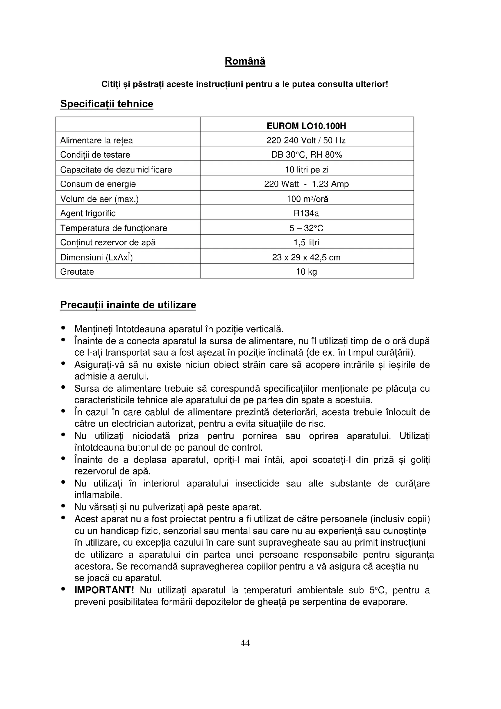 Prin preventa, Euromac bv., Genemuiden-NL declara faptul cădezumidificatorul marca EUROM, tip LO10.100H, este în conformitate cu directiva LVD 2006/95/CEși cu directiva CEM 2004/108/CE (modificata prin 93/68/CEE)șiăndeplinește următoarele standarde:
