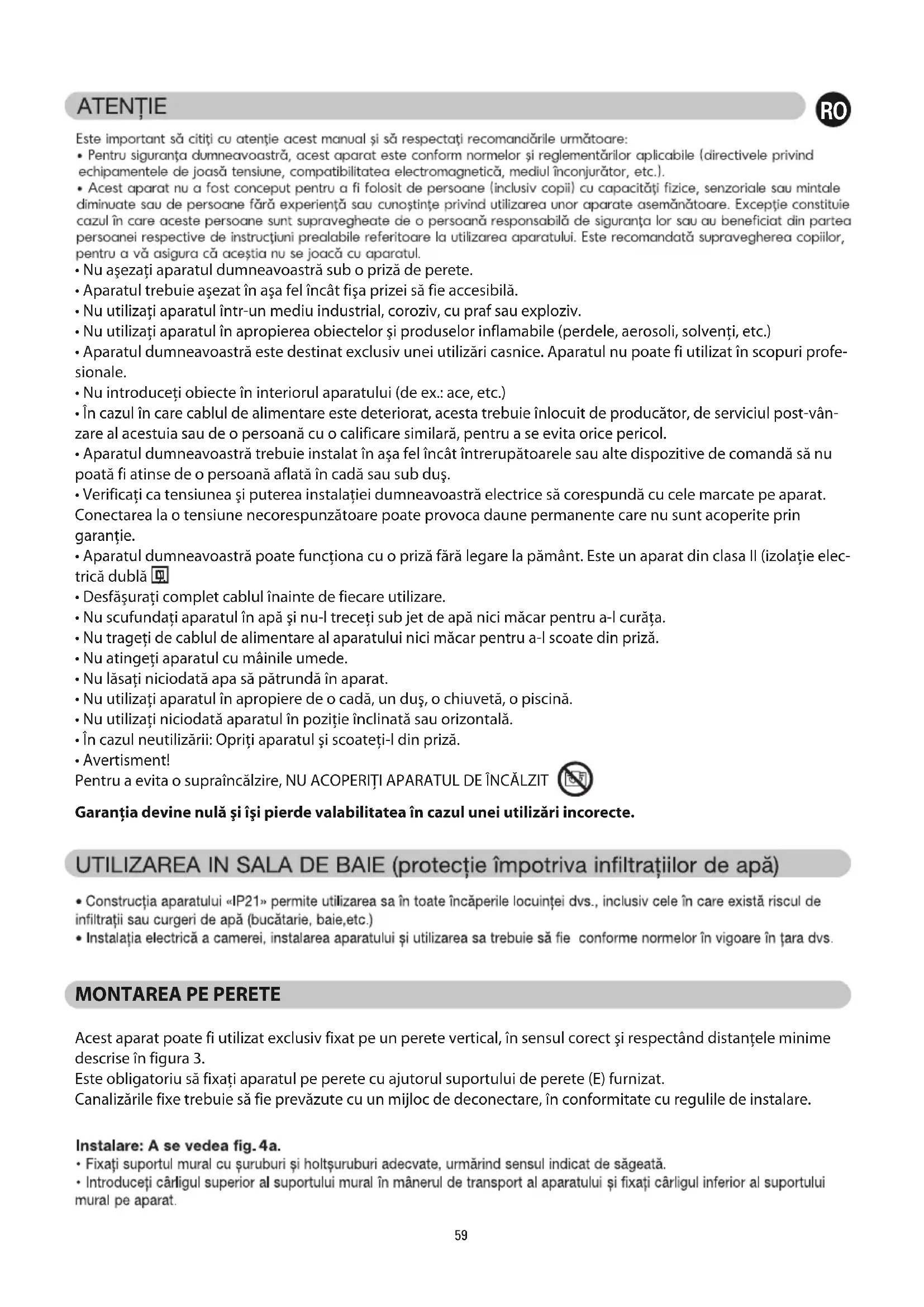 - Avertisment! Pentru a evita o supraîncălzire, NU ACOPERIŢI APARATUL DE ÎNCĂLZIT Garanţia devine nulă şi îşi pierde valabilitatea în cazul unei utilizări incorecte.