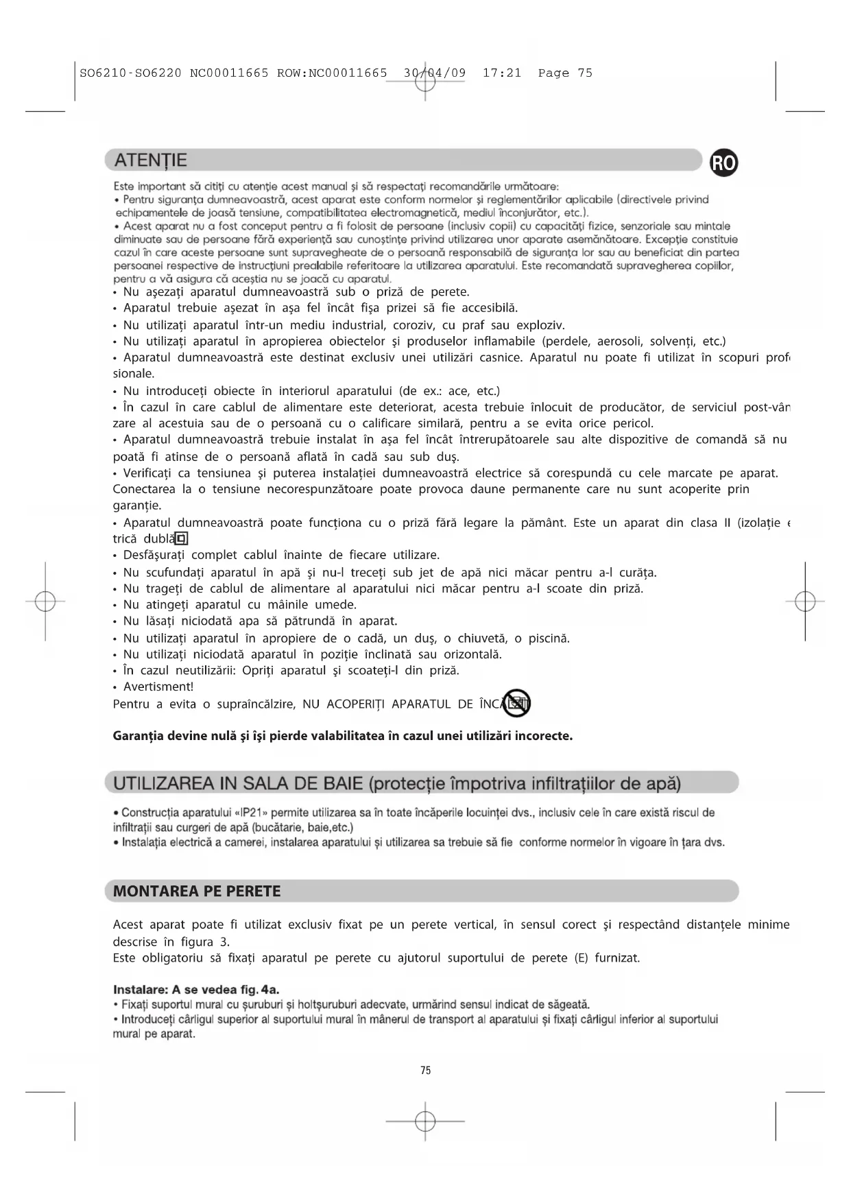 Acest aparat poate fi utilizat exclusiv fixat pe un perete vertical, în sensul corect şi respectând distanţele minime descrise în figura 3. Este obligatoriu să fixaţi aparatul pe perete cu ajutorul suportului de perete (E) furnizat. SO6210-SO6220 NC00011665 ROW:NC00011665 30/04/09 17:21 Page 7576
