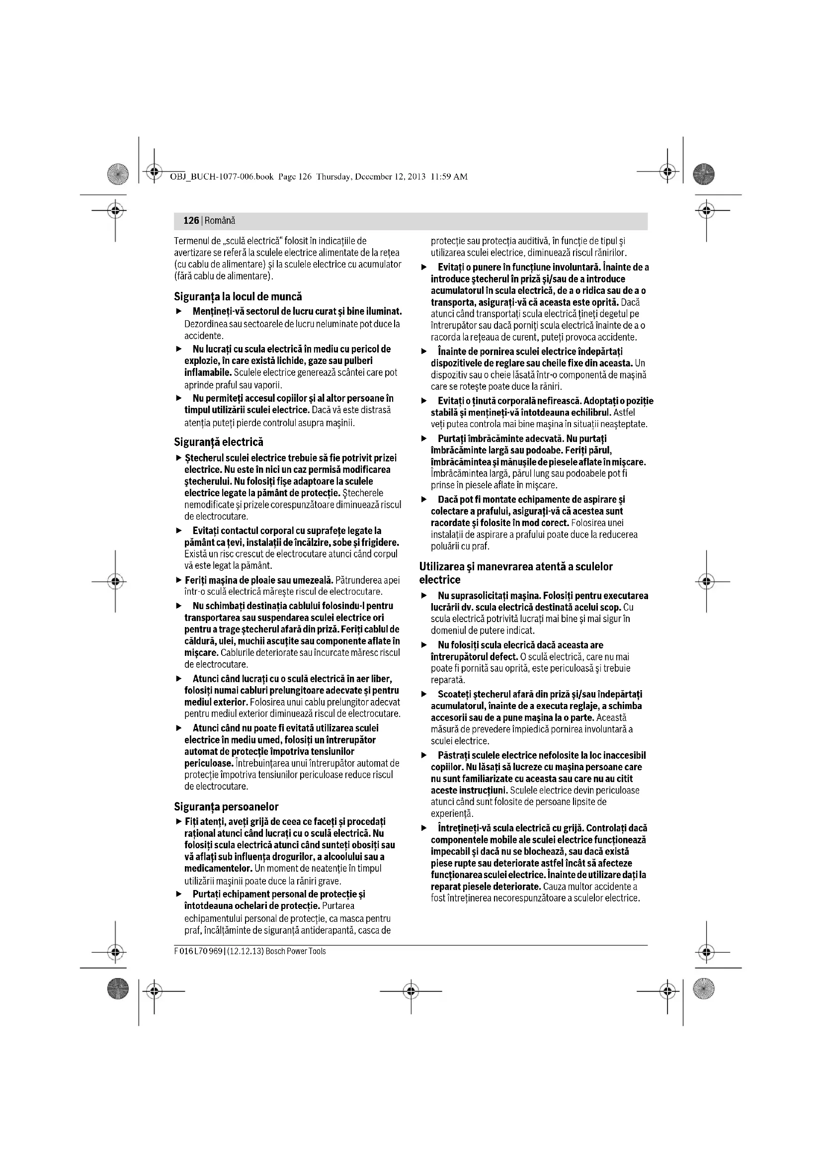 Садові інструменти, приладдя і упаковку треба здавати на екологічно чисту повторну переробку. Не викидайте садові інструменти, зарядні пристрої та акумуляторні батареї/батарейки в побутове сміття! Лише для країн ЄС: Відповідно до європейської директиви 2012/19/EU та європейської директиви 2006/66/EС відпрацьовані електро- і електронні інструменти, пошкоджені або відпрацьовані акумуляторні батареї/батарейки повинні здаватися окремо і утилізуватися екологічно чистим способом. Інтегровані акумуляторні батареї дозволяється виймати лише для утилізації. При відкриванні обшивки корпусу можливе зруйнування садового інструменту. Щоб вийняти акумулятор з садового інструменту, натискуйте на вимикач до тих пір, поки акумулятор повністю не розрядиться. Викрутіть гвинти на корпусі і зніміть ооболонку корпуса. Роз’єднайте з’єднання акумулятора і витягніть акумулятор. Акумулятори/батарейки: Літієво-іонні: Будь ласка, зважайте на вказівки в розділі «Транспортування». Можливі зміни. Română Instrucţiuni privind siguranţa şi protecţia muncii Explicarea pictogramelor Citiţi toate indicaţiile de avertizare şi instrucţiunile. Nerespectarea indicaţiilor de avertizare şi a instrucţiunilor poate provoca electrocutare, incendii şi/sau răniri grave. Purtaţi întotdeauna ochelari de protecţie şi încălţăminte solidă atunci când lucraţi cu scula electrică de grădină. Averţi grijă ca persoanele aflate în apropiere să nu fie rănite de corpurile străine aruncate de scula electrică. Avertisment: menţineţi o distanţă sigură faţă de scula de grădină cât timp aceasta lucrează. Nu folosiţi scula electrică de grădină pe timp de ploaie şi nu o expuneţi acţiunii ploii. Atenţie: Cuţitul de tăiere se mai mişcă din inerţie şi după oprirea sculei electrice de grădină! Folosiţi încărcătorul numai în spaţii uscate. Indicaţii generale de avertizare pentru scule electrice Citiţi toate indicaţiile de avertizare şi instrucţiunile. Nerespectarea indicaţiilor de avertizare şi a instrucţiunilor poate provoca electrocutare, incendii şi/sau răniri grave. Păstraţi toate indicaţiile de avertizare şi instrucţiunile în vederea utilizărilor viitoare. AVERTISMENT OBJ_BUCH-1077-006.book Page 125 Thursday, December 12, 2013 11:59 AM126 | Română F 016 L70 969 | (12.12.13) Bosch Power Tools Termenul de „sculă electrică“ folosit în indicaţiile de avertizare se referă la sculele electrice alimentate de la reţea (cu cablu de alimentare) şi la sculele electrice cu acumulator (fără cablu de alimentare). Siguranţa la locul de muncă Menţineţi-vă sectorul de lucru curat şi bine iluminat. Dezordinea sau sectoarele de lucru neluminate pot duce la accidente. Nu lucraţi cu scula electrică în mediu cu pericol de explozie, în care există lichide, gaze sau pulberi inflamabile. Sculele electrice generează scântei care pot aprinde praful sau vaporii. Nu permiteţi accesul copiilor şi al altor persoane în timpul utilizării sculei electrice. Dacă vă este distrasă atenţia puteţi pierde controlul asupra maşinii. Siguranţă electrică Ştecherul sculei electrice trebuie să fie potrivit prizei electrice. Nu este în nici un caz permisă modificarea ştecherului. Nu folosiţi fişe adaptoare la sculele electrice legate la pământ de protecţie. Ştecherele nemodificate şi prizele corespunzătoare diminuează riscul de electrocutare. Evitaţi contactul corporal cu suprafeţe legate la pământ ca ţevi, instalaţii de încălzire, sobe şi frigidere. Există un risc crescut de electrocutare atunci când corpul vă este legat la pământ. Feriţi maşina de ploaie sau umezeală. Pătrunderea apei într-o sculă electrică măreşte riscul de electrocutare. Nu schimbaţi destinaţia cablului folosindu-l pentru transportarea sau suspendarea sculei electrice ori pentru a trage ştecherul afară din priză. Feriţi cablul de căldură, ulei, muchii ascuţite sau componente aflate în mişcare. Cablurile deteriorate sau încurcate măresc riscul de electrocutare. Atunci când lucraţi cu o sculă electrică în aer liber, folosiţi numai cabluri prelungitoare adecvate şi pentru mediul exterior. Folosirea unui cablu prelungitor adecvat pentru mediul exterior diminuează riscul de electrocutare. Atunci când nu poate fi evitată utilizarea sculei electrice în mediu umed, folosiţi un întrerupător automat de protecţie împotriva tensiunilor periculoase. Întrebuinţarea unui întrerupător automat de protecţie împotriva tensiunilor periculoase reduce riscul de electrocutare. Siguranţa persoanelor Fiţi atenţi, aveţi grijă de ceea ce faceţi şi procedaţi raţional atunci când lucraţi cu o sculă electrică. Nu folosiţi scula electrică atunci când sunteţi obosiţi sau vă aflaţi sub influenţa drogurilor, a alcoolului sau a medicamentelor. Un moment de neatenţie în timpul utilizării maşinii poate duce la răniri grave. Purtaţi echipament personal de protecţie şi întotdeauna ochelari de protecţie. Purtarea echipamentului personal de protecţie, ca masca pentru praf, încălţăminte de siguranţă antiderapantă, casca de prote