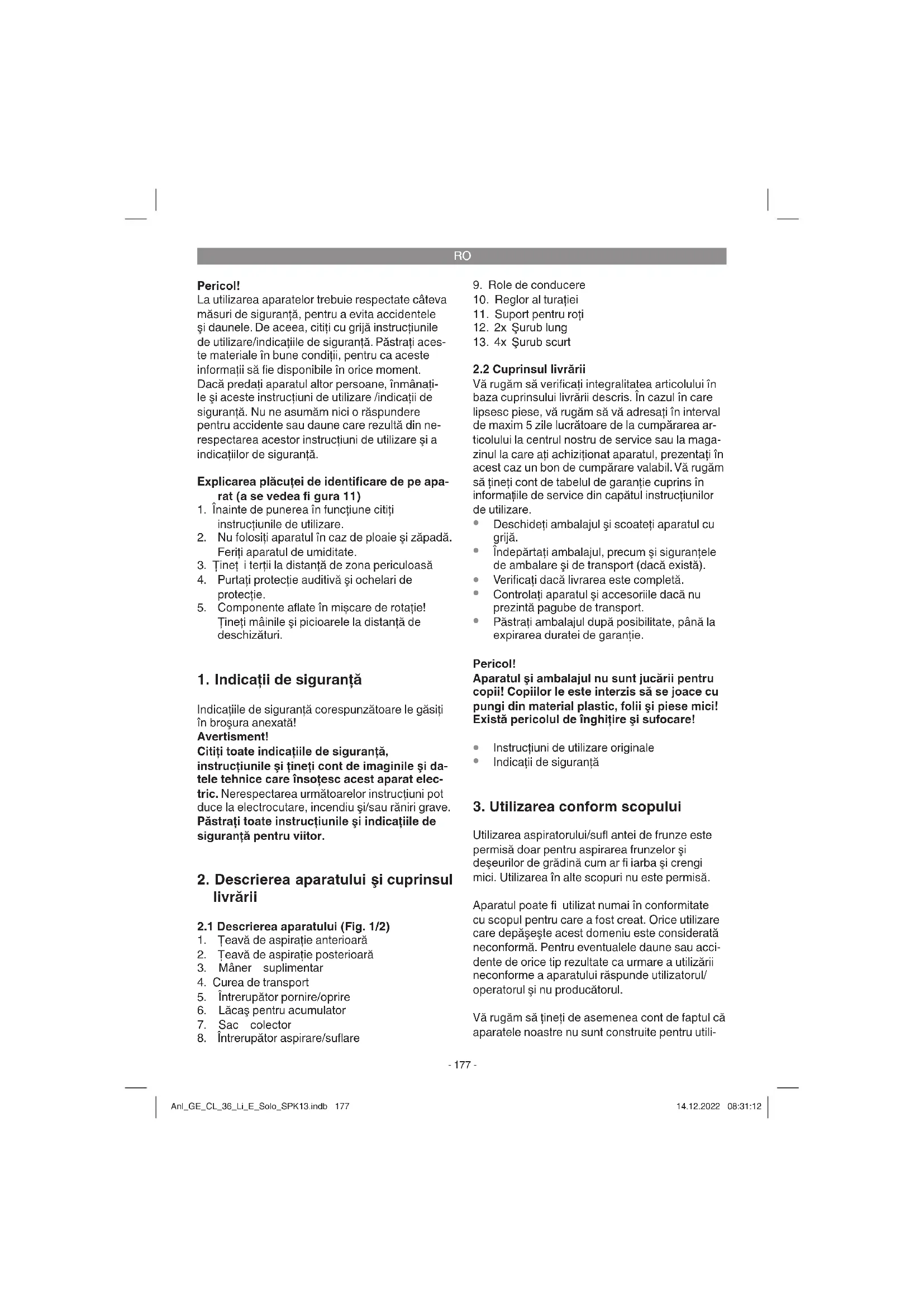 Utilizarea aspiratorului/sufl antei de frunze este permisă doar pentru aspirarea frunzelor şi deşeurilor de grădină cum ar fi iarba şi crengi mici. Utilizarea în alte scopuri nu este permisă. Aparatul poate fi utilizat numai în conformitate cu scopul pentru care a fost creat. Orice utilizare care depăşeşte acest domeniu este considerată neconformă. Pentru eventualele daune sau acci- dente de orice tip rezultate ca urmare a utilizării neconforme a aparatului răspunde utilizatorul/ operatorul şi nu producătorul. Vă rugăm să ţineţi de asemenea cont de faptul că aparatele noastre nu sunt construite pentru utili- Anl_GE_CL_36_Li_E_Solo_SPK13.indb 177Anl_GE_CL_36_Li_E_Solo_SPK13.indb 177 14.12.2022 08:31:1214.12.2022 08:31:12RO