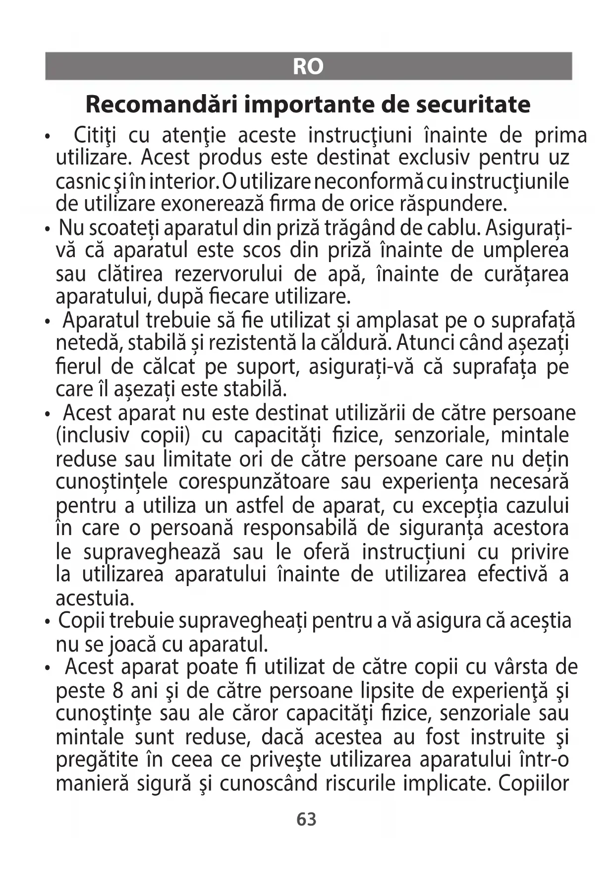 - Acest aparat poate utilizat de către copii cu vârsta de peste 8 ani şi de către persoane lipsite de experienţă şi cunoştinţe sau ale căror capacităţi zice, senzoriale sau mintale sunt reduse, dacă acestea au fost instruite şi pregătite în ceea ce priveşte utilizarea aparatului într-o manieră sigură şi cunoscând riscurile implicate. Copiilor 63nu le este permis să se joace cu aparatul. Curăţarea şi întreţinerea de către utilizator nu pot realizate de copii nesupravegheaţi. Nu lăsaţi erul de călcat şi cablul său de alimentare la îndemâna copiilor cu vârste mai mici de 8 ani atunci când se aă sub tensiune sau în curs de răcire.