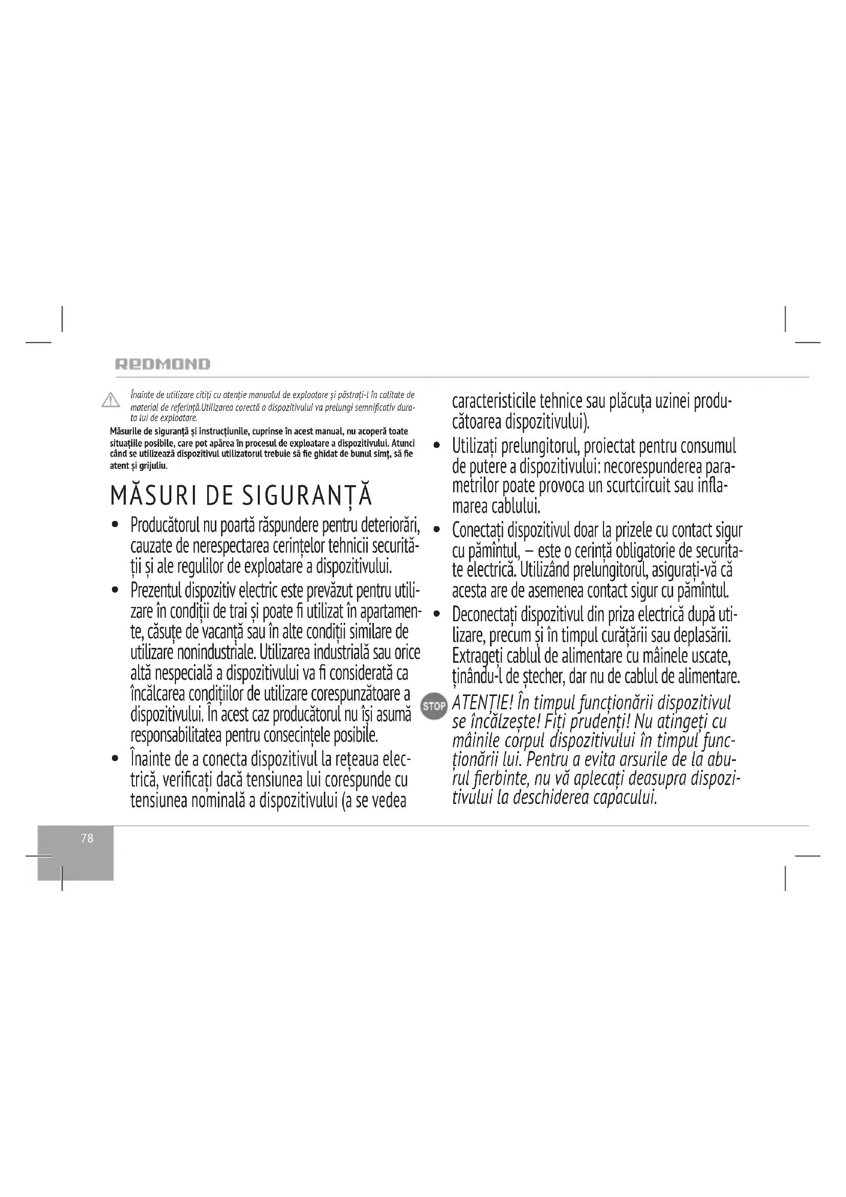 Nu instalați dispozitivul cu vasul de lucru pe o suprafața moale și nerezistentă la căldură, nu-l acoperiți în timpul funcționării: aceasta poate duce la dereglarea funcționării și deterioararea dispo- zitivului.