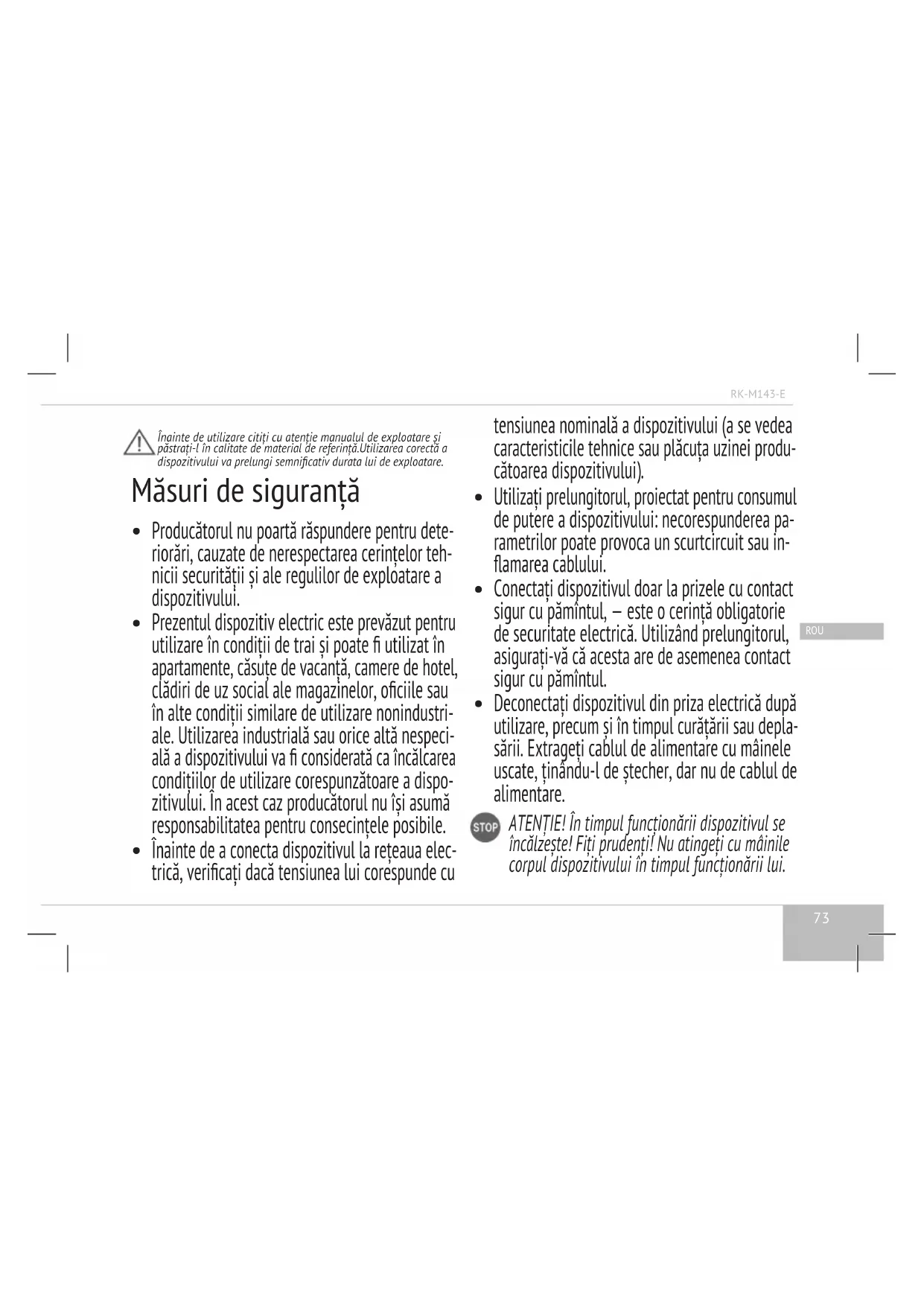 Copiilor în vârstă de 8 ani şi mai mult, precum şi persoanele cu handicap, senzoriale sau psihice, sau lipsa de experienţă şi cunoştinţe, pot utiliza dispozitivul numai sub supravegherea şi/sau în acel caz, dacă au fost instruiţi cu privire la utili- zarea în condiţii de siguranţă a dispozitivului şi75 RK-M143-E ROU sunt conştienţi de pericolul, legat de utilizarea acestuia. Copiii nu trebuie să se joace cu aparatul. Păstraţi aparatul şi cablul de alimentare în locuri neaccesibile copiilor sub 8 ani. Curăţarea şi în- treţinerea dispozitivului nu trebuie să e efec- tuate de copii fără supravegherea unui adult.