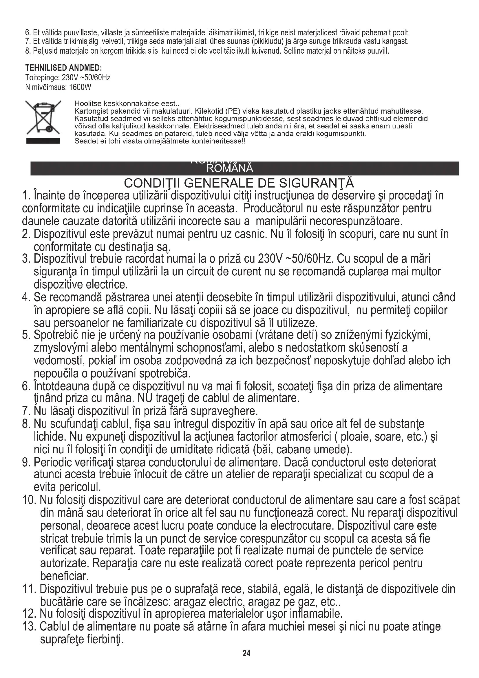 A nu se călca Din grija pentru mediul înconjurător. Ambalajele din carton vă rugăm să le transmiteţi şa centrele de maculatură. Sacii din polietilenă (PE) trebuie aruncate în recipientele pentru materialele plastice. Dispozitivul uzat trebuie transmis la punctul corespunzător de depozitare, deoarece componentele periculoase care se găsesc în dispozitiv pot fi foarte periculoase pentru mediul înconjurător. Dispozitivul electric trebuie transmis în aşa fel încât să se limiteze utilizarea lui repetată. Dacă în dispozitiv se găsesc baterii acestea trebuiesc scoase şi transmise către punctul de depozitare a acestora, separat.BOSANSKI