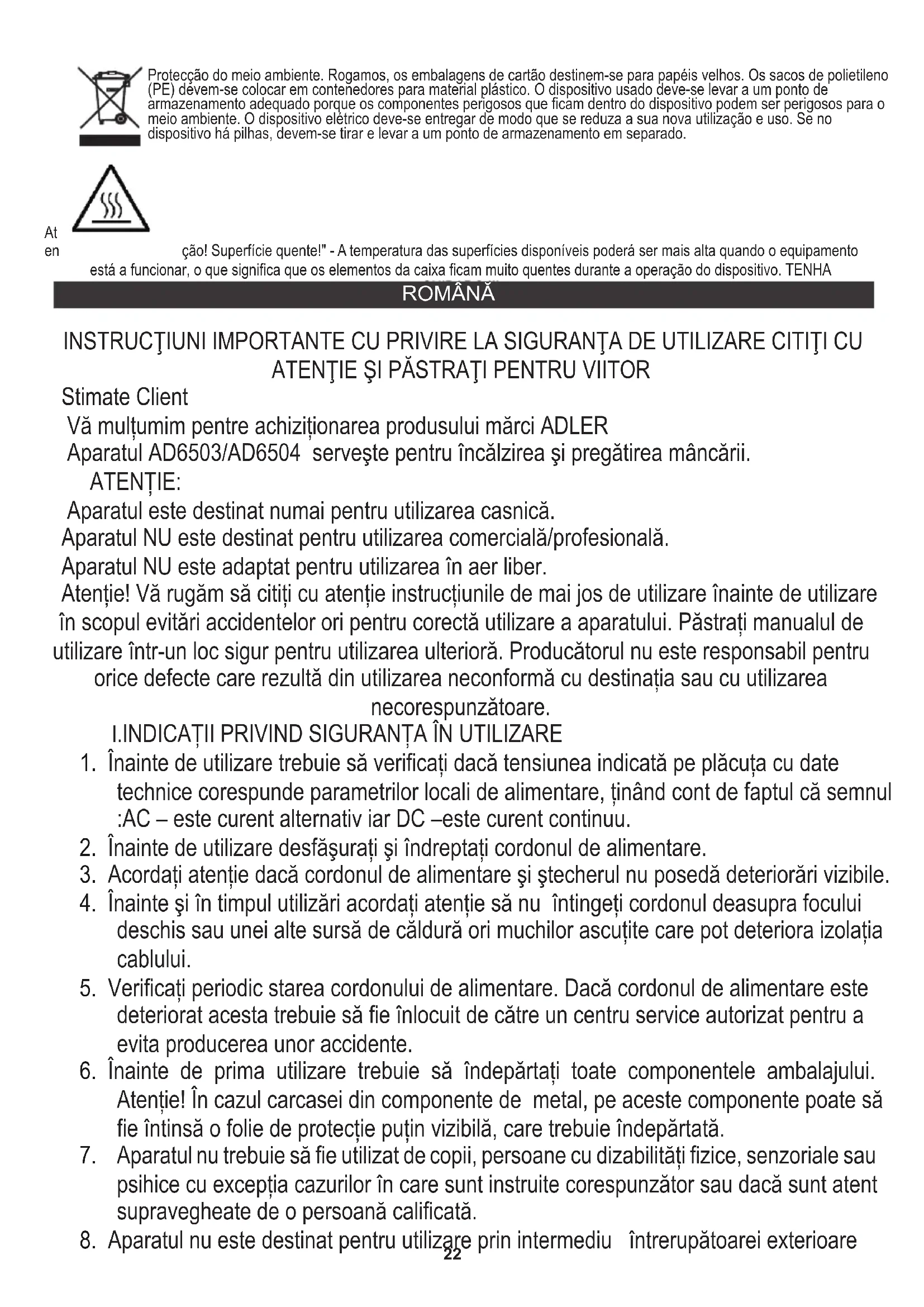 AD6503: AD6504: 3.Se durante a limpeza, tais elementos como a ficha de alimentação, os contatos elétricos do termostato etc. forem molhados, deverão ser secados antes de serem usados novamente. 2.Limpe com um pano macio e húmido as placas de aquecimento sujas, os restos de comida queimados. 1.Limpe a caixa [1] com um pano húmido, aplicando um pouco de líquida para lavar loiça. Fonte de alimentação Fonte de alimentação 4.ATENÇÃO: O forno não pode ser imerso em água ou qualquer outro líquido. Potência: 1500W Potência 2500W 21At en ção! Superfície quente!" - A temperatura das superfícies disponíveis poderá ser mais alta quando o equipamento está a funcionar, o que significa que os elementos da caixa ficam muito quentes durante a operação do dispositivo. TENHA CUIDADO !!! INSTRUCŢIUNI IMPORTANTE CU PRIVIRE LA SIGURANŢA DE UTILIZARE CITIŢI CU ATENŢIE ŞI PĂSTRAŢI PENTRU VIITOR Stimate Client Vă mulțumim pentre achiziționarea produsului mărci ADLER Aparatul NU este destinat pentru utilizarea comercială/profesională. Aparatul NU este adaptat pentru utilizarea în aer liber. ATENȚIE: Atenție! Vă rugăm să citiți cu atenție instrucțiunile de mai jos de utilizare înainte de utilizare în scopul evitări accidentelor ori pentru corectă utilizare a aparatului. Păstrați manualul de utilizare într-un loc sigur pentru utilizarea ulterioră. Producătorul nu este responsabil pentru orice defecte care rezultă din utilizarea neconformă cu destinația sau cu utilizarea necorespunzătoare. Aparatul AD6503/AD6504 serveşte pentru încălzirea şi pregătirea mâncării. Aparatul este destinat numai pentru utilizarea casnică.