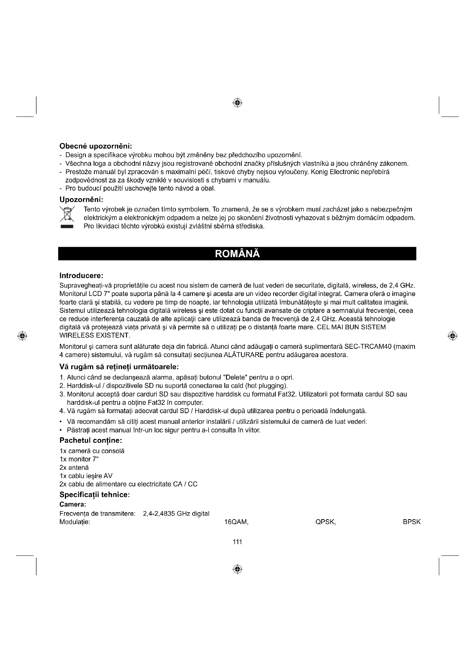 Hard disk mobil introdus cu succes Card SD introdus cu succes Denumire cameră Cameră curentă122 Stare înregistrare Intensitatea semnalului Măsuri de siguranţă: Pentru a se reduce pericolul de electrocutare, acest produs va fi desfăcut NUMAI de către un tehnician avizat, când este necesară depanarea. Deconectaţi produsul de la priza de reţea sau alte echipamente în cazul apariţiei unei probleme. Nu expuneţi produsul apei sau umezelii. Întreţinere: Curăţarea trebuie făcută cu o cârpă uscată. Nu folosiţi solvenţi sau agenţi de curăţare abrazivi. Garanţie: Nu oferim nicio garanţie şi nu ne asumăm niciun fel de responsabilitate în cazul schimbărilor sau modificărilor aduse acestui produs sau în cazul deteriorării cauzate de utilizarea incorectă a produsului. Generalităţi: - Designul şi specificaţiile produsului pot fi modificate fără o notificare prealabilă. - Toate siglele mărcilor şi denumirile produselor sunt mărci comerciale sau mărci comerciale înregistrate ale proprietarilor de drept şi prin prezenta sunt recunoscute ca atare. - Acest manual a fost conceput cu atenţie. Cu toate acestea, nu se pot oferi drepturi pe baza sa. König Electronic nu acceptă răspunderea pentru nicio eroare din acest manual sau consecinţele ce decurg din acestea. - Păstraţi acest manual şi ambalajul pentru consultări ulterioare. Atenţie: Pe acest produs se află acest marcaj. Acesta semnifică faptul că produsele electrice şi electronice nu trebuie eliminate odată cu gunoiul menajer. Aceste produse au un sistem separat de colectare.123 ΕΛΛΗΝΙΚA Ασύρματο σύστημα ασφαλείας