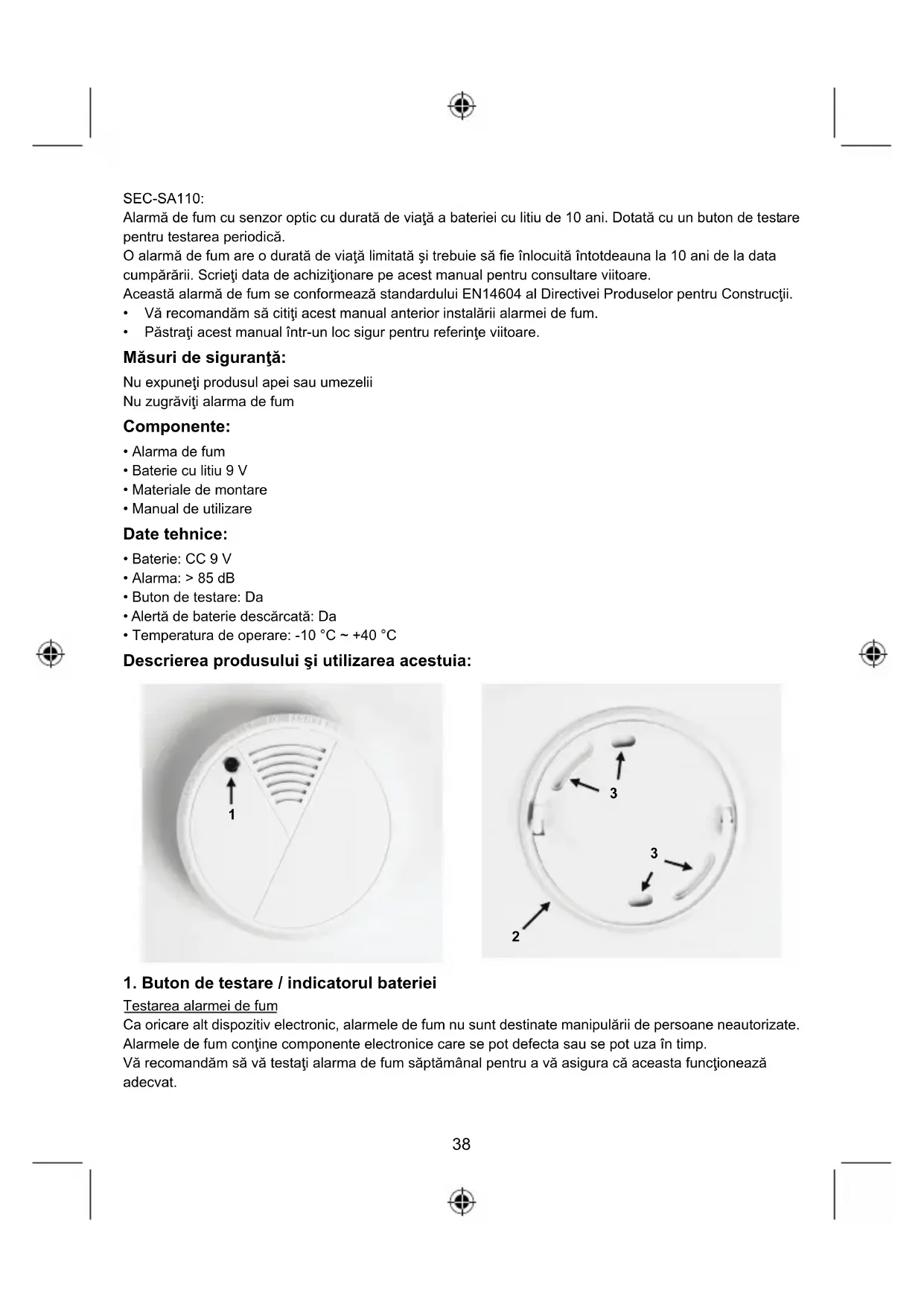 - Păstraţi acest manual într-un loc sigur pentru referinţe viitoare. Măsuri de siguranţă: Nu expuneţi produsul apei sau umezelii Nu zugrăviţi alarma de fum Componente: