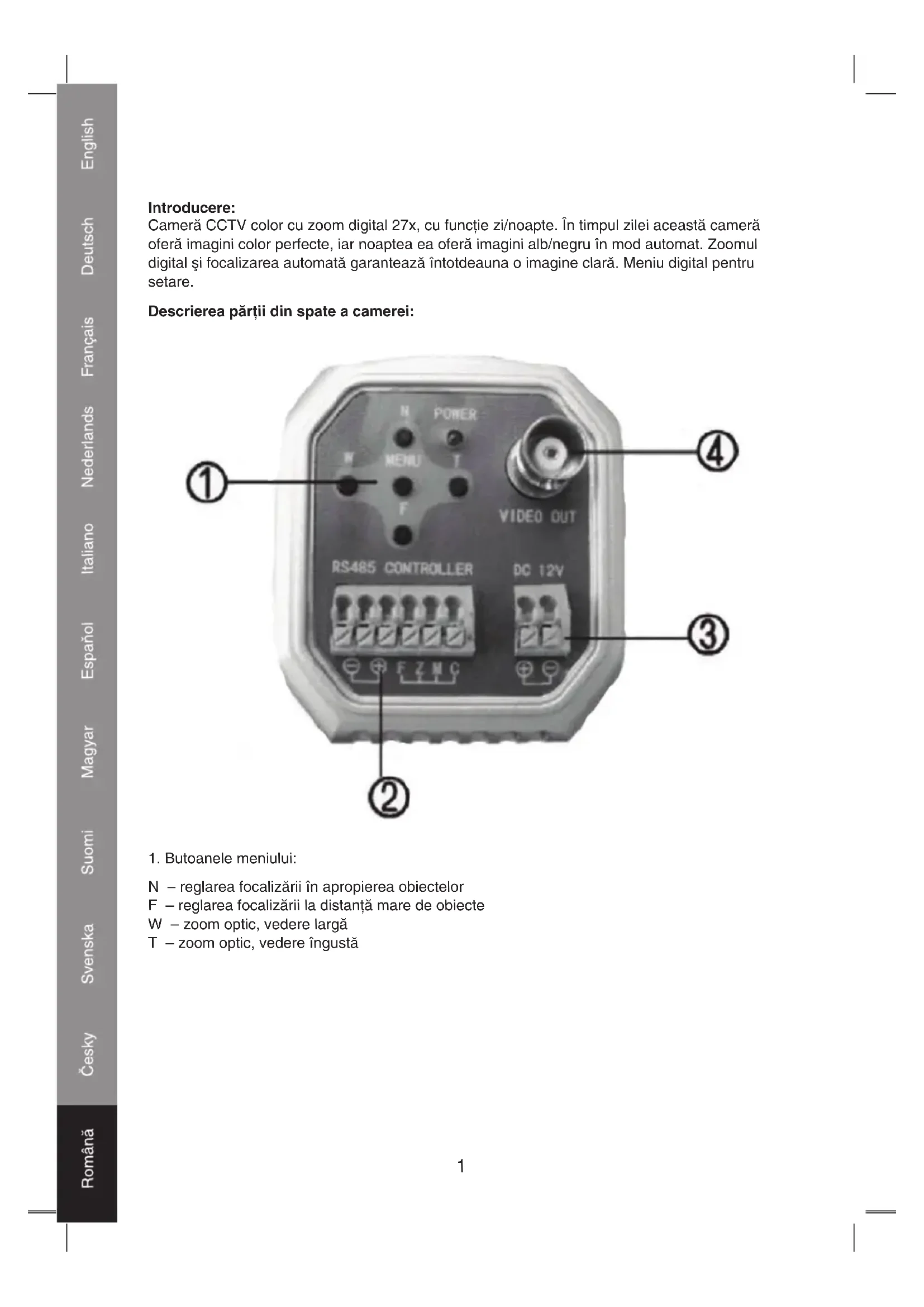 ZOOM 27x1 Introducere: Cameră CCTV color cu zoom digital 27x, cu funcţie zi/noapte. În timpul zilei această cameră oferă imagini color perfecte, iar noaptea ea oferă imagini alb/negru în mod automat. Zoomul digital şi focalizarea automată garantează întotdeauna o imagine clară. Meniu digital pentru setare. Descrierea părţii din spate a camerei: