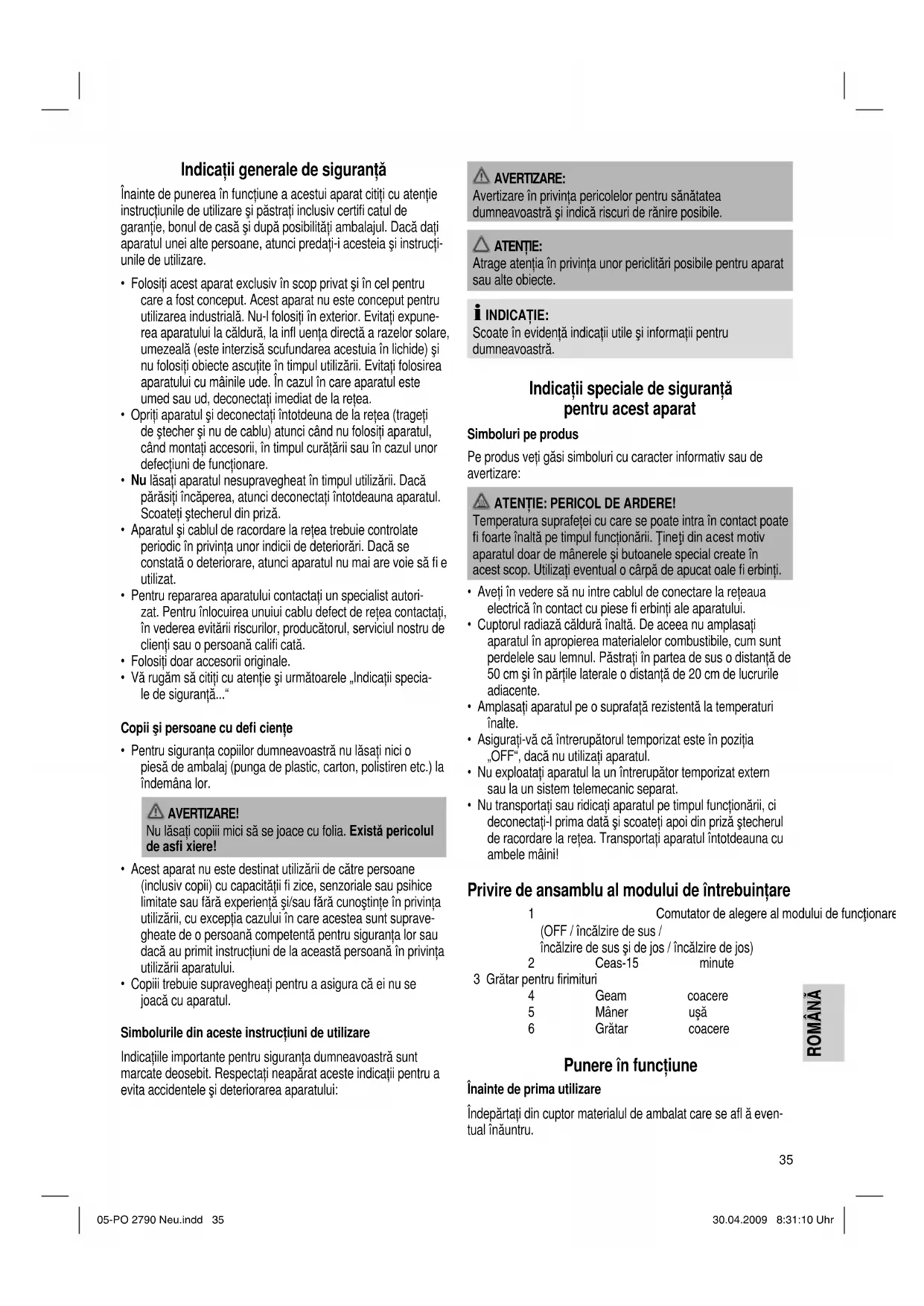 - Nu transportaţi sau ridicaţi aparatul pe timpul funcţionării, ci deconectaţi-l prima dată şi scoateţi apoi din priză ştecherul de racordare la reţea. Transportaţi aparatul întotdeauna cu ambele mâini! Privire de ansamblu al modului de întrebuinţare 1 Comutator de alegere al modului de funcflionare (OFF / încălzire de sus / încălzire de sus şi de jos / încălzire de jos) 2 Ceas-15 minute 3 Grætar pentru firimituri 4 Geam coacere 5 Mâner uøæ 6 Grætar coacere Punere în funcţiune Înainte de prima utilizare Îndepărtaţi din cuptor materialul de ambalat care se afl ă even- tual înăuntru. 05-PO 2790 Neu.indd 3505-PO 2790 Neu.indd 35 30.04.2009 8:31:10 Uhr30.04.2009 8:31:10 Uhr36 ROMÂNĂ ROMÂNĂ ATENŢIE: Înainte de prima utilizare exploataţi aparatul pe o durată de 15 minute pentru îndepărtarea stratului de protecţie al spiralei de încălzire. Poziţionaţi regulatorul de temperatură pe 250°C. INDICAŢIE: Dezvoltarea uşoară de fum şi miros este normală la această operaţie. Asiguraţi o aerisire sufi cientă. Utilizare