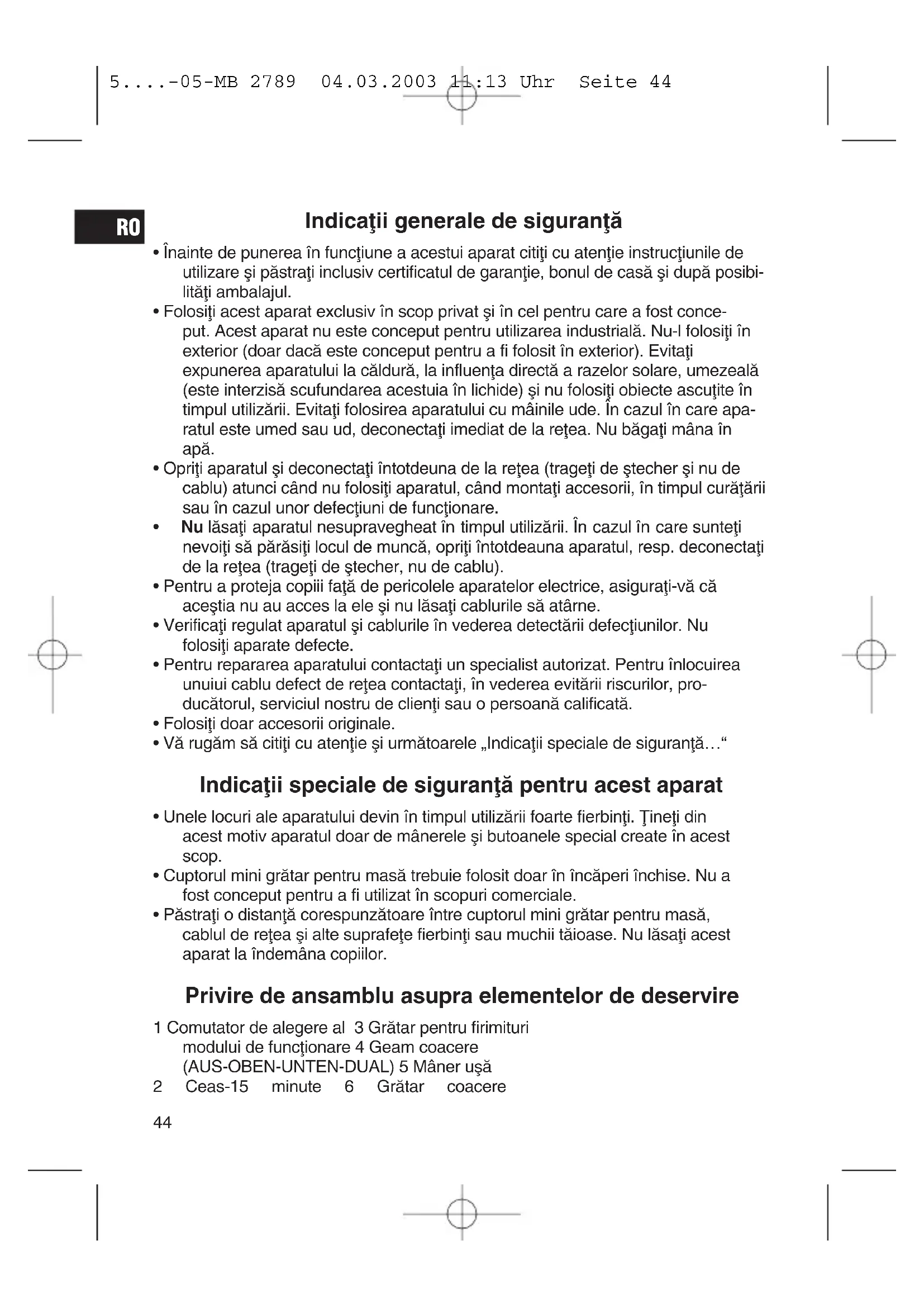 5....-05-MB 2789 04.03.2003 11:13 Uhr Seite 45Alimente Cant./Buc. Timp Tipul de încælzire Cotlet de miel 2-3 11-14 min pe o parte încælzire de sus Pui 1 jumætate 15-20 min pe o parte încælzire de sus Aceste recomandæri reprezintæ doar valori dupæ care sæ væ putefli ghida øi pot fi variate în funcflie de dorinflele dvs. Curæflare