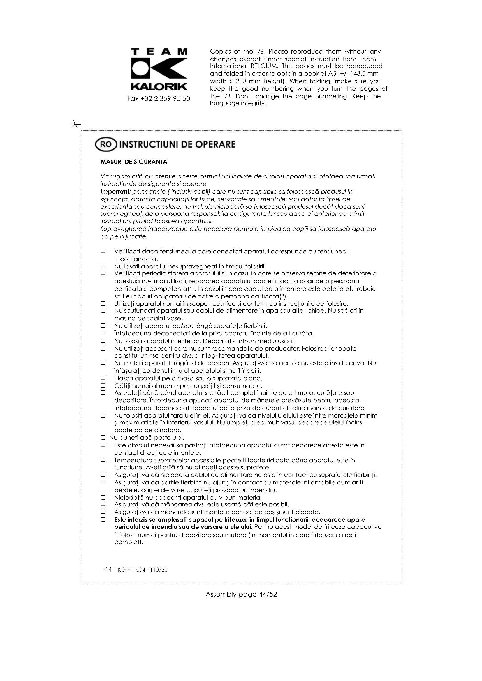 Vă rugăm citiţi cu atenţie aceste instrucţiuni înainte de a folosi aparatul si intotdeauna urmati instructiunile de siguranta si operare. Important: persoanele ( inclusiv copii) care nu sunt capabile sa folosească produsul in siguranţa, datorita capacitaţii lor fizice, senzoriale sau mentale, sau datorita lipsei de experienţa sau cunoaştere, nu trebuie niciodată sa folosească produsul decât daca sunt supravegheaţi de o persoana responsabila cu siguranţa lor sau daca ei anterior au primit instrucţiuni privind folosirea aparatului. Supravegherea îndeaproape este necesara pentru a împiedica copiii sa folosească aparatul ca pe o jucărie. Verificati daca tensiunea la care conectati aparatul corespunde cu tensiunea recomandata. Nu lasati aparatul nesupravegheat in timpul folosirii. Verificati periodic starera aparatului si in cazul in care se observa semne de deteriorare a acestuia nu-l mai utilizati; repararea aparatului poate fi facuta doar de o persoana calificata si competenta(*). In cazul in care cablul de alimentare este deteriorat, trebuie sa fie inlocuit obligatoriu de catre o persoana calificata(*). Utilizaţi aparatul numai in scopuri casnice si conform cu instrucţiunile de folosire. Nu scufundaţi aparatul sau cablul de alimentare in apa sau alte lichide. Nu spălaţi in maşina de spălat vase. Nu utilizaţi aparatul pe/sau lângă suprafeţe fierbinţi. Întotdeauna deconectaţi de la priza aparatul înainte de a-l curăţa. Nu folosiţi aparatul in exterior. Depozitaţi-l intr-un mediu uscat. Nu utilizaţi accesorii care nu sunt recomandate de producător. Folosirea lor poate constitui un risc pentru dvs. si integritatea aparatului. Nu mutaţi aparatul trăgând de cordon. Asiguraţi-vă ca acesta nu este prins de ceva. Nu înfăşuraţi cordonul in jurul aparatului si nu îl îndoiţi. Plasaţi aparatul pe o masa sau o suprafaţa plana. Gătiţi numai alimente pentru prăjit şi consumabile. Aşteptaţi până când aparatul s-a răcit complet înainte de a-l muta, curăţare sau depozitare. Întotdeauna apucaţi aparatul de mânerele prevăzute pentru aceasta. Întotdeauna deconectaţi aparatul de la priza de curent electric înainte de curăţare. Nu folosiţi aparatul fără ulei în el. Asiguraţi-vă că nivelul uleiului este între marcajele minim şi maxim aflate în interiorul vasului. Nu umpleţi prea mult vasul deoarece uleiul încins poate da pe dinafară. Nu puneţi apă peste ulei. Este absolut necesar să păstraţi întotdeauna aparatul curat deoarece acesta este în contact direct cu alimentele. Temperatura suprafeţelor accesibile poate fi foarte ridicată când aparatul este în funcţiune. Aveţi grijă să nu atingeţi aceste suprafeţe. Asiguraţi-vă că niciodată cablul de alimentare nu este în contact cu suprafeţele fierbinţi. Asiguraţi-vă că părţile fierbinţi nu ajung în contact cu materiale inflamabile cum ar fi perdele, cârpe de vase … puteţi provoca un incendiu. Niciodată nu acoperiţi aparatul cu vreun material. Asiguraţi-vă că mâncarea dvs. este uscată cât este posibil. Asiguraţi-vă că mânerele sunt montate correct pe coş şi sunt blocate. Este interzis sa amplasati capacul pe friteuza, in timpul functionarii, deaoarece apare pericolul de incendiu sau de varsare a uleiului. Pentru acest model de friteuza capacul va fi folosit numai pentru depozitare sau mutare (in momentul in care friteuza s-a racit complet). Copies of the I/B. Please reproduce them without any changes except under special instruction from Team International BELGIUM. The pages must be reproduced and folded in order to obtain a booklet A5 (+/- 148.5 mm width x 210 mm height). When folding, make sure you keep the good numbering when you turn the pages of the I/B. Don‟t change the page numbering. Keep the language integrity.