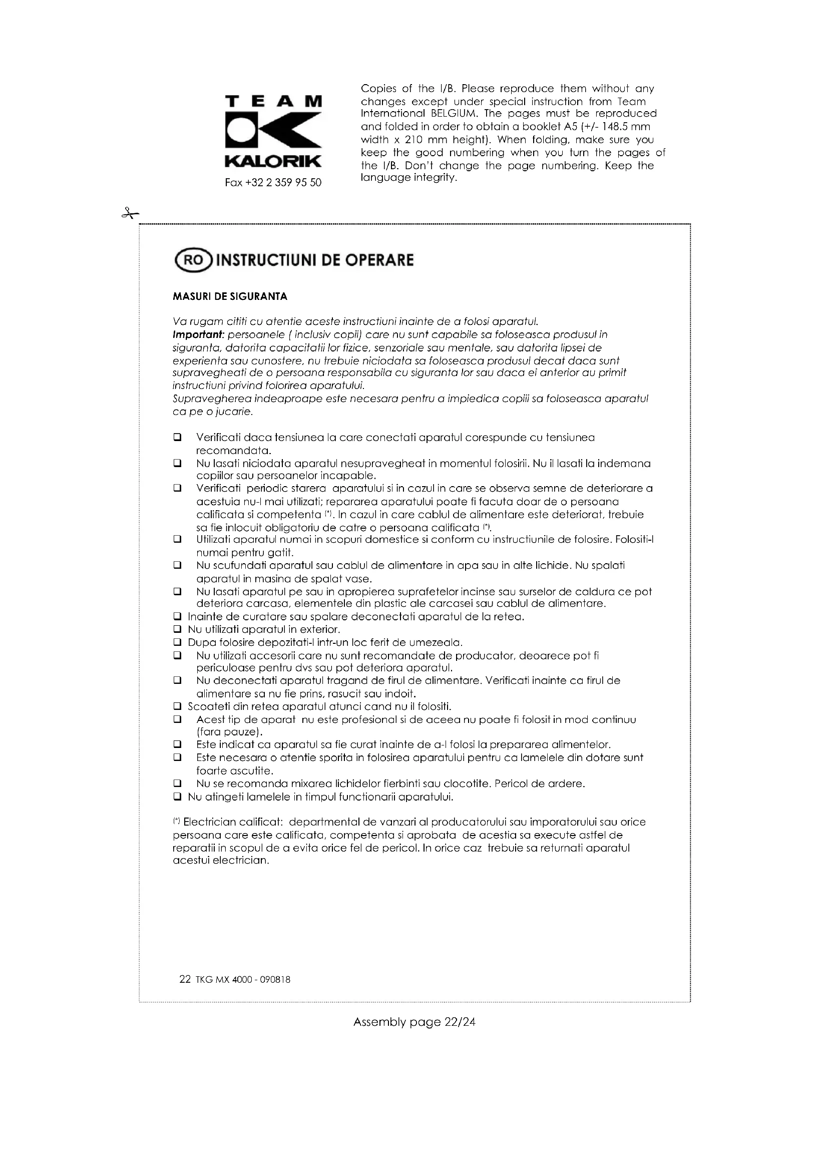 Simbolul de pe tăbliţa cu datele tehnice înseamnă că produsul nu se poate arunca împreună cu alte reziduuri menajere. Legea pedepseşte cu amendă persoanele care aruncă aparatele electrice şi electronice împreună cu alte reziduuri. Debarasarea corespunzătoare a produselor uzate previne formarea unor efecte negative pentru mediul natural şi sănătatea umană, care pot fi produse de manipularea nepotrivită a reziduurilor rămase din uzarea aparatelor electronice. Copies of the I/B. Please reproduce them without any changes except under special instruction from Team International BELGIUM. The pages must be reproduced and folded in order to obtain a booklet A5 (+/- 148.5 mm width x 210 mm height). When folding, make sure you keep the good numbering when you turn the pages of the I/B. Don’t change the page numbering. Keep the language integrity.