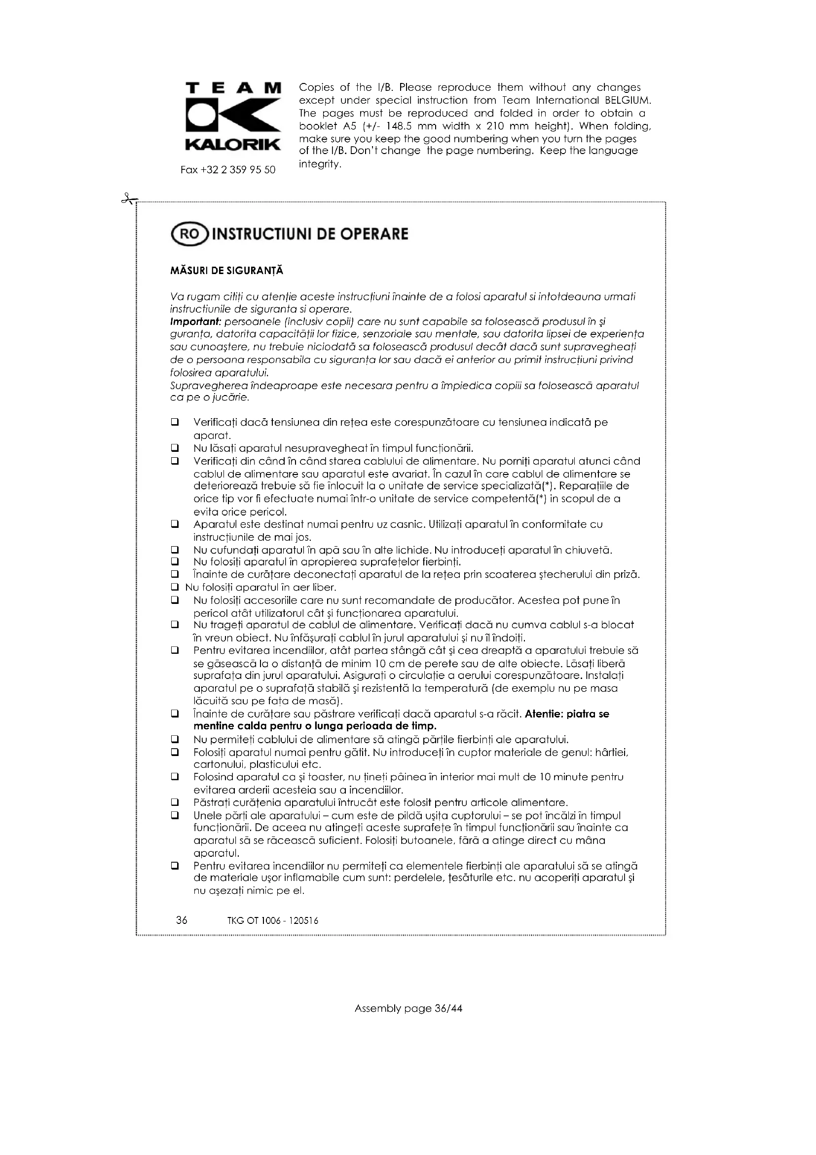 Simbolul de pe tăbliţa cu datele tehnice înseamnă că produsul nu se poate arunca împreună cu alte reziduuri menajere. Legea pedepseşte cu amendă persoanele care aruncă aparatele electrice şi electronice împreună cu alte reziduuri. Debarasarea corespunzătoare a produselor uzate previne formarea unor efecte negative pentru mediul natural şi sănătatea umană, care pot fi produse de manipularea nepotrivită a reziduurilor rămase din uzarea aparatelor electronice.Copies of the I/B. Please reproduce them without any changes except under special instruction from Team International BELGIUM. The pages must be reproduced and folded in order to obtain a booklet A5 (+/- 148.5 mm width x 210 mm height). When folding, make sure you keep the good numbering when you turn the pages of the I/B. Don’t change the page numbering. Keep the language integrity.