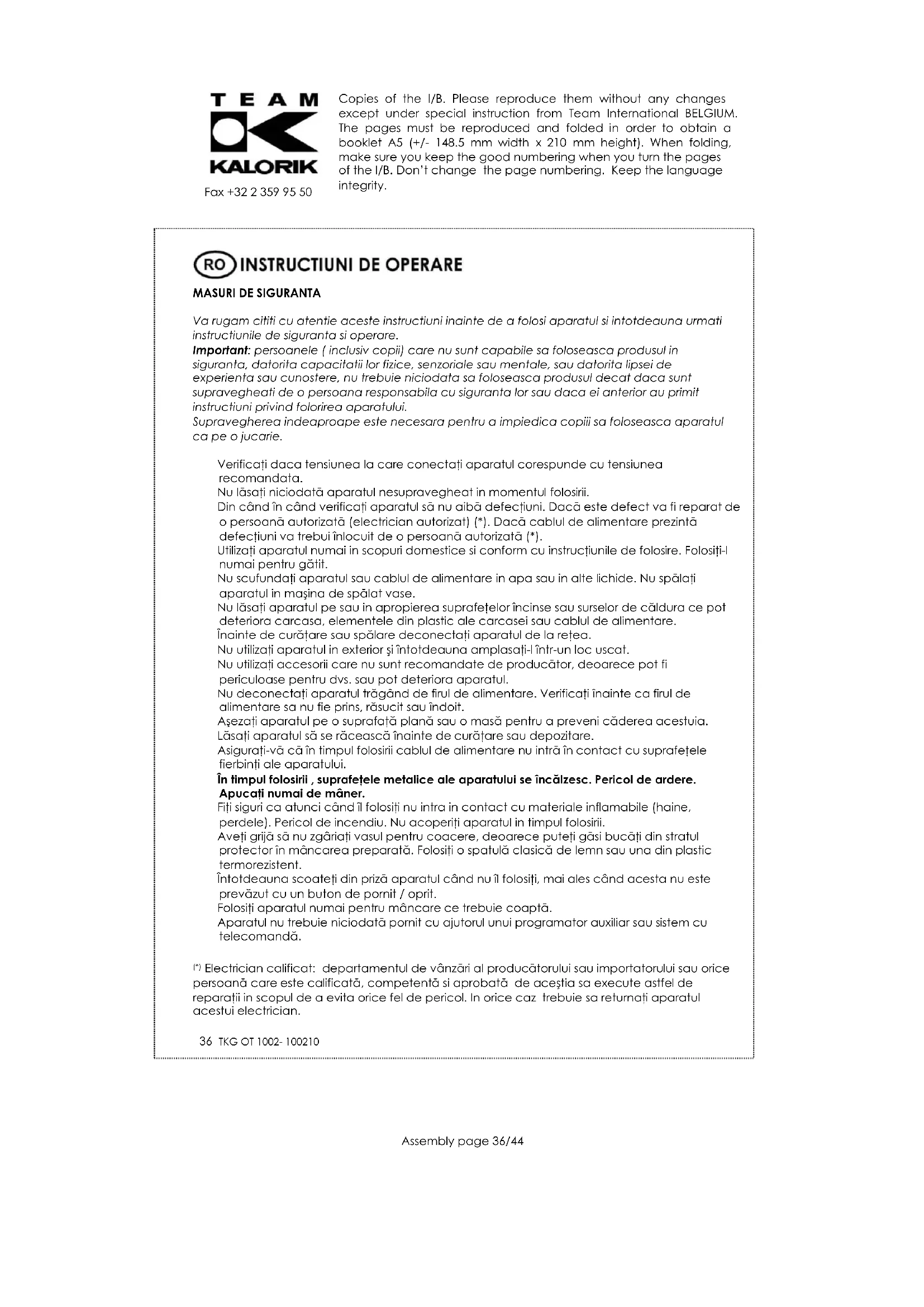Simbolul de pe tăbliţa cu datele tehnice înseamnă că produsul nu se poate arunca împreună cu alte reziduuri menajere. Legea pedepseşte cu amendă persoanele care aruncă aparatele electrice şi electronice împreună cu alte reziduuri. Debarasarea corespunzătoare a produselor uzate previne formarea unor efecte negative pentru mediul natural şi sănătatea umană, care pot fi produse de manipularea nepotrivită a reziduurilor rămase din uzarea aparatelor electronice.Copies of the I/B. Please reproduce them without any changes except under special instruction from Team International BELGIUM. The pages must be reproduced and folded in order to obtain a booklet A5 (+/- 148.5 mm width x 210 mm height). When folding, make sure you keep the good numbering when you turn the pages of the I/B. Don’t change the page numbering. Keep the language integrity.
