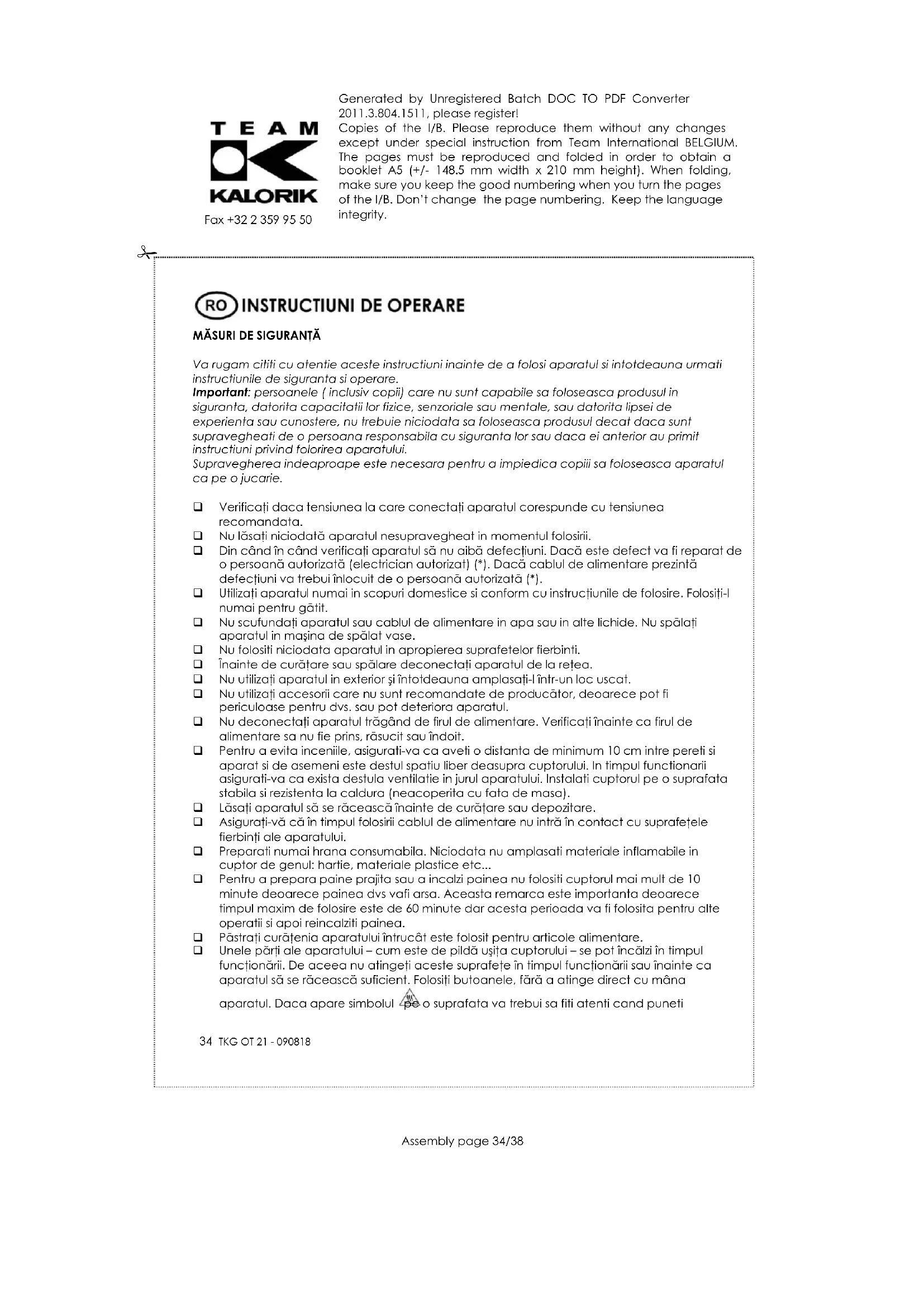 Va rugam cititi cu atentie aceste instructiuni inainte de a folosi aparatul si intotdeauna urmati instructiunile de siguranta si operare. Important: persoanele ( inclusiv copii) care nu sunt capabile sa foloseasca produsul in siguranta, datorita capacitatii lor fizice, senzoriale sau mentale, sau datorita lipsei de experienta sau cunostere, nu trebuie niciodata sa foloseasca produsul decat daca sunt supravegheati de o persoana responsabila cu siguranta lor sau daca ei anterior au primit instructiuni privind folorirea aparatului. Supravegherea indeaproape este necesara pentru a impiedica copiii sa foloseasca aparatul ca pe o jucarie. Verificaţi daca tensiunea la care conectaţi aparatul corespunde cu tensiunea recomandata. Nu lăsaţi niciodată aparatul nesupravegheat in momentul folosirii. Din când în când verificaţi aparatul să nu aibă defecţiuni. Dacă este defect va fi reparat de o persoană autorizată (electrician autorizat) (*). Dacă cablul de alimentare prezintă defecţiuni va trebui înlocuit de o persoană autorizată (*). Utilizaţi aparatul numai in scopuri domestice si conform cu instrucţiunile de folosire. Folosiţi-l numai pentru gătit. Nu scufundaţi aparatul sau cablul de alimentare in apa sau in alte lichide. Nu spălaţi aparatul in maşina de spălat vase. Nu folositi niciodata aparatul in apropierea suprafetelor fierbinti. Înainte de curăţare sau spălare deconectaţi aparatul de la reţea. Nu utilizaţi aparatul in exterior şi întotdeauna amplasaţi-l într-un loc uscat. Nu utilizaţi accesorii care nu sunt recomandate de producător, deoarece pot fi periculoase pentru dvs. sau pot deteriora aparatul. Nu deconectaţi aparatul trăgând de firul de alimentare. Verificaţi înainte ca firul de alimentare sa nu fie prins, răsucit sau îndoit. Pentru a evita inceniile, asigurati-va ca aveti o distanta de minimum 10 cm intre pereti si aparat si de asemeni este destul spatiu liber deasupra cuptorului. In timpul functionarii asigurati-va ca exista destula ventilatie in jurul aparatului. Instalati cuptorul pe o suprafata stabila si rezistenta la caldura (neacoperita cu fata de masa). Lăsaţi aparatul să se răcească înainte de curăţare sau depozitare. Asiguraţi-vă că în timpul folosirii cablul de alimentare nu intră în contact cu suprafeţele fierbinţi ale aparatului. Preparati numai hrana consumabila. Niciodata nu amplasati materiale inflamabile in cuptor de genul: hartie, materiale plastice etc... Pentru a prepara paine prajita sau a incalzi painea nu folositi cuptorul mai mult de 10 minute deoarece painea dvs vafi arsa. Aceasta remarca este importanta deoarece timpul maxim de folosire este de 60 minute dar acesta perioada va fi folosita pentru alte operatii si apoi reincalziti painea. Păstraţi curăţenia aparatului întrucât este folosit pentru articole alimentare. Unele părţi ale aparatului – cum este de pildă uşiţa cuptorului – se pot încălzi în timpul funcţionării. De aceea nu atingeţi aceste suprafeţe în timpul funcţionării sau înainte ca aparatul să se răcească suficient. Folosiţi butoanele, fără a atinge direct cu mâna aparatul. Daca apare simbolul pe o suprafata va trebui sa fiti atenti cand punetiGenerated by Unregistered Batch DOC TO PDF Converter 2011.3.804.1511, please register! Copies of the I/B. Please reproduce them without any changes except under special instruction from Team International BELGIUM. The pages must be reproduced and folded in order to obtain a booklet A5 (+/- 148.5 mm width x 210 mm height). When folding, make sure you keep the good numbering when you turn the pages of the I/B. Don’t change the page numbering. Keep the language integrity.