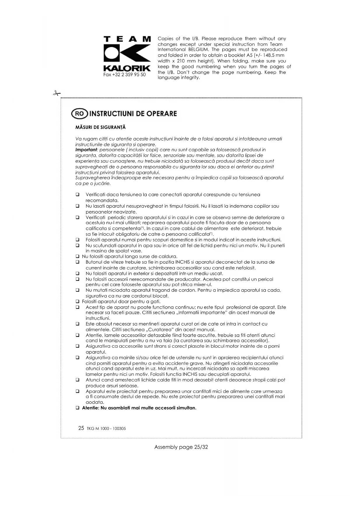 Folositi aparatul numai pentru scopuri domestice si in modul indicat in aceste instructiuni. Nu scufundati aparatul in apa sau in orice alt fel de lichid pentru nici un motiv. Nu il puneti in masina de spalat vase. Nu folositi aparatul langa surse de caldura. Butonul de viteze trebuie sa fie in pozitia INCHIS si aparatul deconectat de la sursa de current inainte de curatare, schimbarea accesoriilor sau cand este nefolosit. Nu folositi aparatul in exterior si depozitatil intr-un mediu uscat. Nu folositi accesorii nerecomandate de producator. Acestea pot constitui un pericol pentru cel care foloseste aparatul sau pot strica mixer-ul. Nu mutati niciodata aparatul tragand de cordon. Pentru a impiedica aparatul sa cada, sigurativa ca nu are cordonul blocat. Folositi aparatul doar pentru a gati. Acest tip de aparat nu poate functiona continuu; nu este tipul profesional de aparat. Este necesar sa faceti pauze. Cititi sectiunea „Informatii importante” din acest manual de instructiuni. Este absolut necesar sa mentineti aparatul curat ori de cate ori intra in contact cu alimentele. Cititi sectiunea „Curatarea” din acest manual. Atentie, lamele accesoriilor detasabile fiind foarte ascutite, trebuie sa fiti atenti atunci cand le manipulati pentru a nu va taia (la curatarea sau schimbarea accesoriilor). Asigurativa ca accesoriile sunt strans si corect plasate in blocul motor inainte de a porni aparatul. Asigurativa ca mainile si/sau orice fel de ustensile nu sunt in aproierea recipientului atunci cind porniti aparatul pentru a evita accidente grave. Nu atingeti niciodata accesoriile atunci cand aparatul este in uz. Mai mult, nu incercati niciodata sa opriti miscarea lamelor pentru nici un motiv. Folositi functia INCHIS sau decuplati aparatul. Atunci cand amestecati lichide calde fiti in mod deosebit atenti deoarece stropii calzi pot produce arsuri serioase. Aparatul este proiectat pentru prepararea unor cantitati mici de alimente care urmeaza a fi consumate destul de repede. Nu este proiectat pentru prepararea unei cantitati mari aodata. Atentie: Nu asamblati mai multe accesorii simultan. Copies of the I/B. Please reproduce them without any changes except under special instruction from Team International BELGIUM. The pages must be reproduced and folded in order to obtain a booklet A5 (+/- 148.5 mm width x 210 mm height). When folding, make sure you keep the good numbering when you turn the pages of the I/B. Don’t change the page numbering. Keep the language integrity.