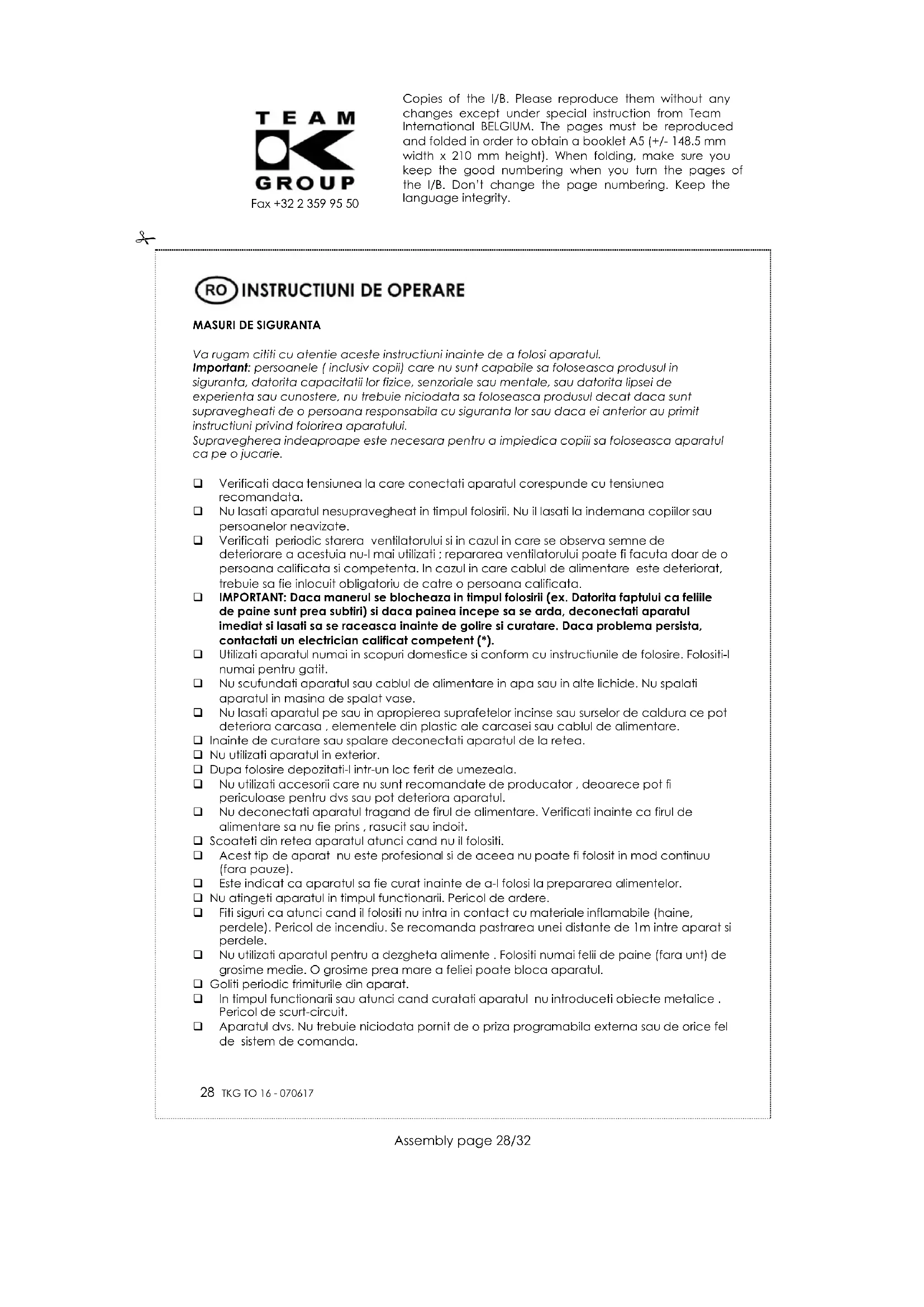 Va rugam cititi cu atentie aceste instructiuni inainte de a folosi aparatul. Important: persoanele ( inclusiv copii) care nu sunt capabile sa foloseasca produsul in siguranta, datorita capacitatii lor fizice, senzoriale sau mentale, sau datorita lipsei de experienta sau cunostere, nu trebuie niciodata sa foloseasca produsul decat daca sunt supravegheati de o persoana responsabila cu siguranta lor sau daca ei anterior au primit instructiuni privind folorirea aparatului. Supravegherea indeaproape este necesara pentru a impiedica copiii sa foloseasca aparatul ca pe o jucarie. Verificati daca tensiunea la care conectati aparatul corespunde cu tensiunea recomandata. Nu lasati aparatul nesupravegheat in timpul folosirii. Nu il lasati la indemana copiilor sau persoanelor neavizate. Verificati periodic starera ventilatorului si in cazul in care se observa semne de deteriorare a acestuia nu-l mai utilizati ; repararea ventilatorului poate fi facuta doar de o persoana calificata si competenta. In cazul in care cablul de alimentare este deteriorat, trebuie sa fie inlocuit obligatoriu de catre o persoana calificata. IMPORTANT: Daca manerul se blocheaza in timpul folosirii (ex. Datorita faptului ca feliile de paine sunt prea subtiri) si daca painea incepe sa se arda, deconectati aparatul imediat si lasati sa se raceasca inainte de golire si curatare. Daca problema persista, contactati un electrician calificat competent (*). Utilizati aparatul numai in scopuri domestice si conform cu instructiunile de folosire. Folositi-l numai pentru gatit. Nu scufundati aparatul sau cablul de alimentare in apa sau in alte lichide. Nu spalati aparatul in masina de spalat vase. Nu lasati aparatul pe sau in apropierea suprafetelor incinse sau surselor de caldura ce pot deteriora carcasa , elementele din plastic ale carcasei sau cablul de alimentare. Inainte de curatare sau spalare deconectati aparatul de la retea. Nu utilizati aparatul in exterior. Dupa folosire depozitati-l intr-un loc ferit de umezeala. Nu utilizati accesorii care nu sunt recomandate de producator , deoarece pot fi periculoase pentru dvs sau pot deteriora aparatul. Nu deconectati aparatul tragand de firul de alimentare. Verificati inainte ca firul de alimentare sa nu fie prins , rasucit sau indoit. Scoateti din retea aparatul atunci cand nu il folositi. Acest tip de aparat nu este profesional si de aceea nu poate fi folosit in mod continuu (fara pauze). Este indicat ca aparatul sa fie curat inainte de a-l folosi la prepararea alimentelor. Nu atingeti aparatul in timpul functionarii. Pericol de ardere. Fiti siguri ca atunci cand il folositi nu intra in contact cu materiale inflamabile (haine, perdele). Pericol de incendiu. Se recomanda pastrarea unei distante de 1m intre aparat si perdele. Nu utilizati aparatul pentru a dezgheta alimente . Folositi numai felii de paine (fara unt) de grosime medie. O grosime prea mare a feliei poate bloca aparatul. Goliti periodic frimiturile din aparat. In timpul functionarii sau atunci cand curatati aparatul nu introduceti obiecte metalice . Pericol de scurt-circuit. Aparatul dvs. Nu trebuie niciodata pornit de o priza programabila externa sau de orice fel de sistem de comanda. Copies of the I/B. Please reproduce them without any changes except under special instruction from Team International BELGIUM. The pages must be reproduced and folded in order to obtain a booklet A5 (+/- 148.5 mm width x 210 mm height). When folding, make sure you keep the good numbering when you turn the pages of the I/B. Don’t change the page numbering. Keep the language integrity.