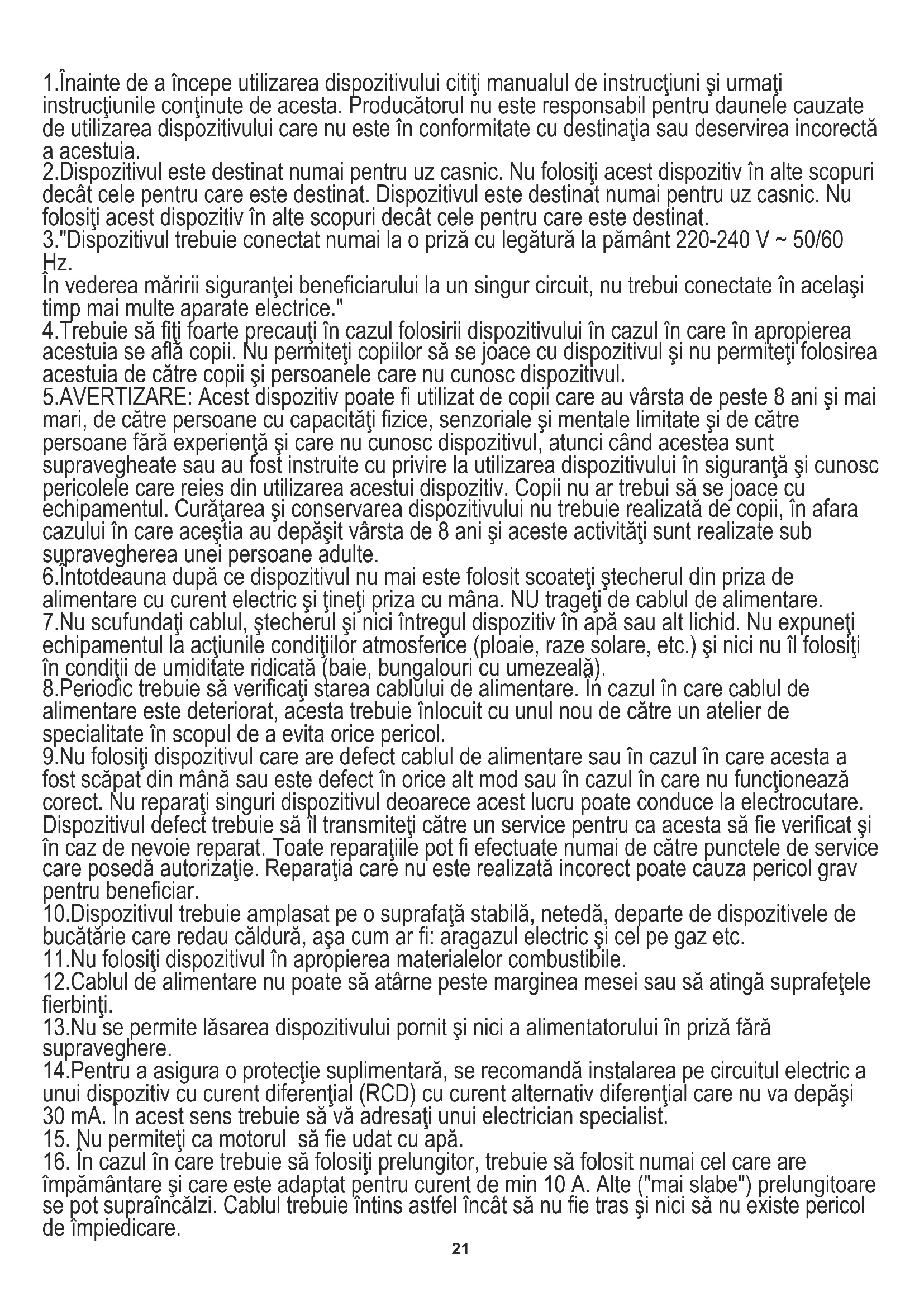 ROMÂNĂ Hoolitse keskkonnakaitse eest. Kartongist pakendid vii makulatuuri. Kilekotid (PE) viska kasutatud plastiku jaoks ettenähtud mahutitesse. Kasutatud seadmed vii selleks ettenähtud kogumispunktidesse, sest seadmes leiduvad ohtlikud elemendid võivad olla kahjulikud keskkonnale. Elektriseadmed tuleb anda nii ära, et seadet ei saaks enam uuesti kasutada. Kui seadmes on patareid, tuleb need välja võtta ja anda eraldi kogumispunkti. Seadet ei tohi visata olmejäätmete konteineritesse!! ROMÂNĂ 201.Înainte de a începe utilizarea dispozitivului citiţi manualul de instrucţiuni şi urmaţi instrucţiunile conţinute de acesta. Producătorul nu este responsabil pentru daunele cauzate de utilizarea dispozitivului care nu este în conformitate cu destinaţia sau deservirea incorectă a acestuia. 2.Dispozitivul este destinat numai pentru uz casnic. Nu folosiţi acest dispozitiv în alte scopuri decât cele pentru care este destinat. Dispozitivul este destinat numai pentru uz casnic. Nu folosiţi acest dispozitiv în alte scopuri decât cele pentru care este destinat. 3."Dispozitivul trebuie conectat numai la o priză cu legătură la pământ 220-240 V ~ 50/60 Hz. În vederea măririi siguranţei beneficiarului la un singur circuit, nu trebui conectate în acelaşi timp mai multe aparate electrice." 4.Trebuie să fiţi foarte precauţi în cazul folosirii dispozitivului în cazul în care în apropierea acestuia se află copii. Nu permiteţi copiilor să se joace cu dispozitivul şi nu permiteţi folosirea acestuia de către copii şi persoanele care nu cunosc dispozitivul. 5.AVERTIZARE: Acest dispozitiv poate fi utilizat de copii care au vârsta de peste 8 ani şi mai mari, de către persoane cu capacităţi fizice, senzoriale şi mentale limitate şi de către persoane fără experienţă şi care nu cunosc dispozitivul, atunci când acestea sunt supravegheate sau au fost instruite cu privire la utilizarea dispozitivului în siguranţă şi cunosc pericolele care reies din utilizarea acestui dispozitiv. Copii nu ar trebui să se joace cu echipamentul. Curăţarea şi conservarea dispozitivului nu trebuie realizată de copii, în afara cazului în care aceştia au depăşit vârsta de 8 ani şi aceste activităţi sunt realizate sub supravegherea unei persoane adulte. 6.Întotdeauna după ce dispozitivul nu mai este folosit scoateţi ştecherul din priza de alimentare cu curent electric şi ţineţi priza cu mâna. NU trageţi de cablul de alimentare. 7.Nu scufundaţi cablul, ştecherul şi nici întregul dispozitiv în apă sau alt lichid. Nu expuneţi echipamentul la acţiunile condiţiilor atmosferice (ploaie, raze solare, etc.) şi nici nu îl folosiţi în condiţii de umiditate ridicată (baie, bungalouri cu umezeală). 8.Periodic trebuie să verificaţi starea cablului de alimentare. În cazul în care cablul de alimentare este deteriorat, acesta trebuie înlocuit cu unul nou de către un atelier de specialitate în scopul de a evita orice pericol. 9.Nu folosiţi dispozitivul care are defect cablul de alimentare sau în cazul în care acesta a fost scăpat din mână sau este defect în orice alt mod sau în cazul în care nu funcţionează corect. Nu reparaţi singuri dispozitivul deoarece acest lucru poate conduce la electrocutare. Dispozitivul defect trebuie să îl transmiteţi către un service pentru ca acesta să fie verificat şi în caz de nevoie reparat. Toate reparaţiile pot fi efectuate numai de către punctele de service care posedă autorizaţie. Reparaţia care nu este realizată incorect poate cauza pericol grav pentru beneficiar. 10.Dispozitivul trebuie amplasat pe o suprafaţă stabilă, netedă, departe de dispozitivele de bucătărie care redau căldură, aşa cum ar fi: aragazul electric şi cel pe gaz etc. 11.Nu folosiţi dispozitivul în apropierea materialelor combustibile. 12.Cablul de alimentare nu poate să atârne peste marginea mesei sau să atingă suprafeţele fierbinţi. 13.Nu se permite lăsarea dispozitivului pornit şi nici a alimentatorului în priză fără supraveghere. 14.Pentru a asigura o protecţie suplimentară, se recomandă instalarea pe circuitul electric a unui dispozitiv cu curent diferenţial (RCD) cu curent alternativ diferenţial care nu va depăşi 30 mA. În acest sens trebuie să vă adresaţi unui electrician specialist.