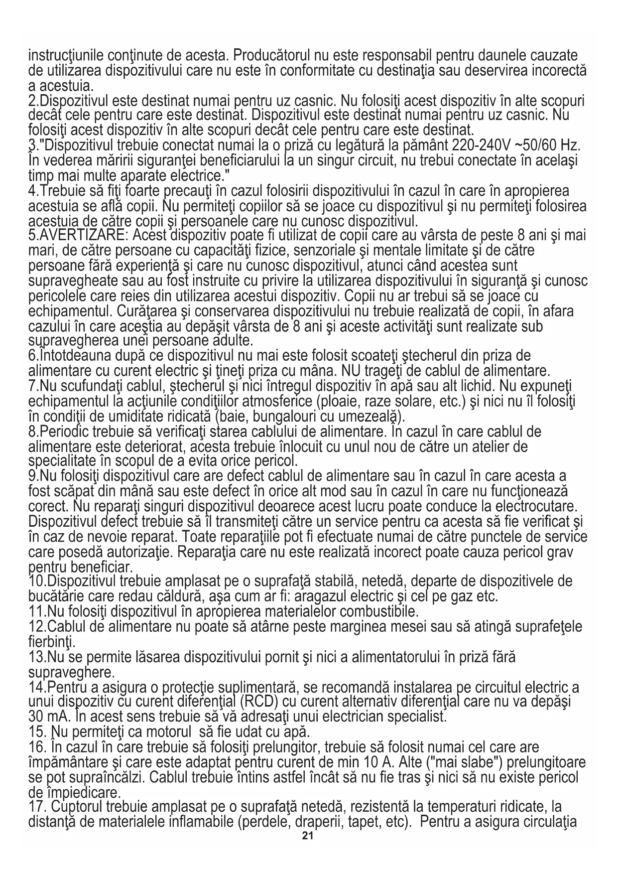 agressiivsed vahendid põhjustavad metallist elementide tumenemist. Soovitatav on käsitsi ROMÂNĂ Hoolitse keskkonnakaitse eest. Kartongist pakendid vii makulatuuri. Kilekotid (PE) viska kasutatud plastiku jaoks ettenähtud mahutitesse. Kasutatud seadmed vii selleks ettenähtud kogumispunktidesse, sest seadmes leiduvad ohtlikud elemendid võivad olla kahjulikud keskkonnale. Elektriseadmed tuleb anda nii ära, et seadet ei saaks enam uuesti kasutada. Kui seadmes on patareid, tuleb need välja võtta ja anda eraldi kogumispunkti. Seadet ei tohi visata olmejäätmete konteineritesse!! ROMÂNĂ 20instrucţiunile conţinute de acesta. Producătorul nu este responsabil pentru daunele cauzate de utilizarea dispozitivului care nu este în conformitate cu destinaţia sau deservirea incorectă a acestuia. 2.Dispozitivul este destinat numai pentru uz casnic. Nu folosiţi acest dispozitiv în alte scopuri decât cele pentru care este destinat. Dispozitivul este destinat numai pentru uz casnic. Nu folosiţi acest dispozitiv în alte scopuri decât cele pentru care este destinat. 3."Dispozitivul trebuie conectat numai la o priză cu legătură la pământ 220-240V ~50/60 Hz. În vederea măririi siguranţei beneficiarului la un singur circuit, nu trebui conectate în acelaşi timp mai multe aparate electrice." 4.Trebuie să fiţi foarte precauţi în cazul folosirii dispozitivului în cazul în care în apropierea acestuia se află copii. Nu permiteţi copiilor să se joace cu dispozitivul şi nu permiteţi folosirea acestuia de către copii şi persoanele care nu cunosc dispozitivul. 5.AVERTIZARE: Acest dispozitiv poate fi utilizat de copii care au vârsta de peste 8 ani şi mai mari, de către persoane cu capacităţi fizice, senzoriale şi mentale limitate şi de către persoane fără experienţă şi care nu cunosc dispozitivul, atunci când acestea sunt supravegheate sau au fost instruite cu privire la utilizarea dispozitivului în siguranţă şi cunosc pericolele care reies din utilizarea acestui dispozitiv. Copii nu ar trebui să se joace cu echipamentul. Curăţarea şi conservarea dispozitivului nu trebuie realizată de copii, în afara cazului în care aceştia au depăşit vârsta de 8 ani şi aceste activităţi sunt realizate sub supravegherea unei persoane adulte. 6.Întotdeauna după ce dispozitivul nu mai este folosit scoateţi ştecherul din priza de alimentare cu curent electric şi ţineţi priza cu mâna. NU trageţi de cablul de alimentare. 7.Nu scufundaţi cablul, ştecherul şi nici întregul dispozitiv în apă sau alt lichid. Nu expuneţi echipamentul la acţiunile condiţiilor atmosferice (ploaie, raze solare, etc.) şi nici nu îl folosiţi în condiţii de umiditate ridicată (baie, bungalouri cu umezeală). 8.Periodic trebuie să verificaţi starea cablului de alimentare. În cazul în care cablul de alimentare este deteriorat, acesta trebuie înlocuit cu unul nou de către un atelier de specialitate în scopul de a evita orice pericol. 9.Nu folosiţi dispozitivul care are defect cablul de alimentare sau în cazul în care acesta a fost scăpat din mână sau este defect în orice alt mod sau în cazul în care nu funcţionează corect. Nu reparaţi singuri dispozitivul deoarece acest lucru poate conduce la electrocutare. Dispozitivul defect trebuie să îl transmiteţi către un service pentru ca acesta să fie verificat şi în caz de nevoie reparat. Toate reparaţiile pot fi efectuate numai de către punctele de service care posedă autorizaţie. Reparaţia care nu este realizată incorect poate cauza pericol grav pentru beneficiar. 10.Dispozitivul trebuie amplasat pe o suprafaţă stabilă, netedă, departe de dispozitivele de bucătărie care redau căldură, aşa cum ar fi: aragazul electric şi cel pe gaz etc. 11.Nu folosiţi dispozitivul în apropierea materialelor combustibile. 12.Cablul de alimentare nu poate să atârne peste marginea mesei sau să atingă suprafeţele fierbinţi. 13.Nu se permite lăsarea dispozitivului pornit şi nici a alimentatorului în priză fără supraveghere. 14.Pentru a asigura o protecţie suplimentară, se recomandă instalarea pe circuitul electric a unui dispozitiv cu curent diferenţial (RCD) cu curent alternativ diferenţial care nu va depăşi 30 mA. În acest sens trebuie să vă adresaţi unui electrician specialist.