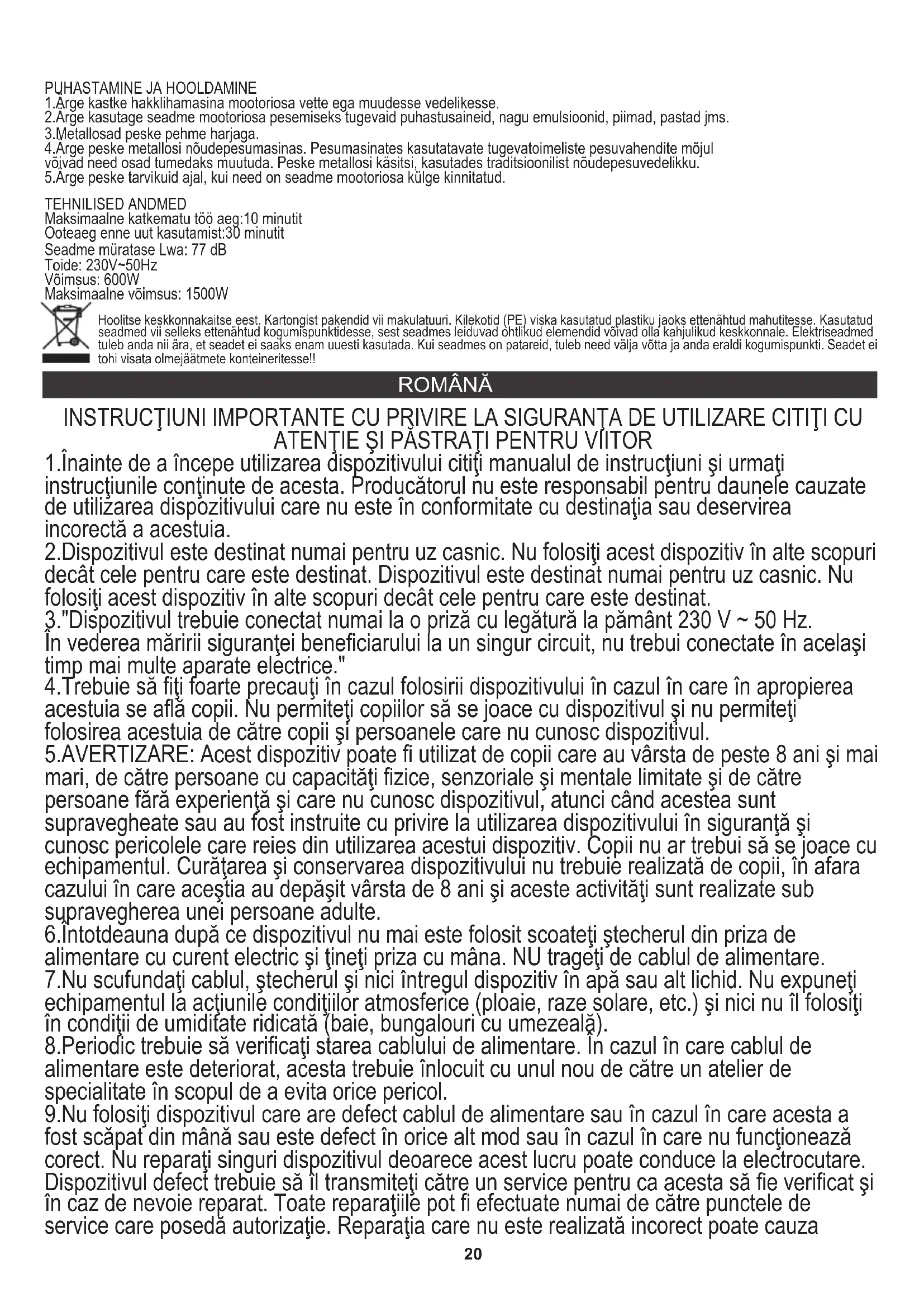 INSTRUCŢIUNI IMPORTANTE CU PRIVIRE LA SIGURANŢA DE UTILIZARE CITIŢI CU ATENŢIE ŞI PĂSTRAŢI PENTRU VIITOR 1.Înainte de a începe utilizarea dispozitivului citiţi manualul de instrucţiuni şi urmaţi instrucţiunile conţinute de acesta. Producătorul nu este responsabil pentru daunele cauzate de utilizarea dispozitivului care nu este în conformitate cu destinaţia sau deservirea incorectă a acestuia. 2.Dispozitivul este destinat numai pentru uz casnic. Nu folosiţi acest dispozitiv în alte scopuri decât cele pentru care este destinat. Dispozitivul este destinat numai pentru uz casnic. Nu folosiţi acest dispozitiv în alte scopuri decât cele pentru care este destinat. 3."Dispozitivul trebuie conectat numai la o priză cu legătură la pământ 230 V ~ 50 Hz. În vederea măririi siguranţei beneficiarului la un singur circuit, nu trebui conectate în acelaşi timp mai multe aparate electrice." 4.Trebuie să fiţi foarte precauţi în cazul folosirii dispozitivului în cazul în care în apropierea acestuia se află copii. Nu permiteţi copiilor să se joace cu dispozitivul şi nu permiteţi folosirea acestuia de către copii şi persoanele care nu cunosc dispozitivul. 5.AVERTIZARE: Acest dispozitiv poate fi utilizat de copii care au vârsta de peste 8 ani şi mai mari, de către persoane cu capacităţi fizice, senzoriale şi mentale limitate şi de către persoane fără experienţă şi care nu cunosc dispozitivul, atunci când acestea sunt supravegheate sau au fost instruite cu privire la utilizarea dispozitivului în siguranţă şi cunosc pericolele care reies din utilizarea acestui dispozitiv. Copii nu ar trebui să se joace cu echipamentul. Curăţarea şi conservarea dispozitivului nu trebuie realizată de copii, în afara cazului în care aceştia au depăşit vârsta de 8 ani şi aceste activităţi sunt realizate sub supravegherea unei persoane adulte. 6.Întotdeauna după ce dispozitivul nu mai este folosit scoateţi ştecherul din priza de alimentare cu curent electric şi ţineţi priza cu mâna. NU trageţi de cablul de alimentare. 7.Nu scufundaţi cablul, ştecherul şi nici întregul dispozitiv în apă sau alt lichid. Nu expuneţi echipamentul la acţiunile condiţiilor atmosferice (ploaie, raze solare, etc.) şi nici nu îl folosiţi în condiţii de umiditate ridicată (baie, bungalouri cu umezeală). 8.Periodic trebuie să verificaţi starea cablului de alimentare. În cazul în care cablul de alimentare este deteriorat, acesta trebuie înlocuit cu unul nou de către un atelier de specialitate în scopul de a evita orice pericol. 9.Nu folosiţi dispozitivul care are defect cablul de alimentare sau în cazul în care acesta a fost scăpat din mână sau este defect în orice alt mod sau în cazul în care nu funcţionează corect. Nu reparaţi singuri dispozitivul deoarece acest lucru poate conduce la electrocutare. Dispozitivul defect trebuie să îl transmiteţi către un service pentru ca acesta să fie verificat şi în caz de nevoie reparat. Toate reparaţiile pot fi efectuate numai de către punctele de service care posedă autorizaţie. Reparaţia care nu este realizată incorect poate cauza