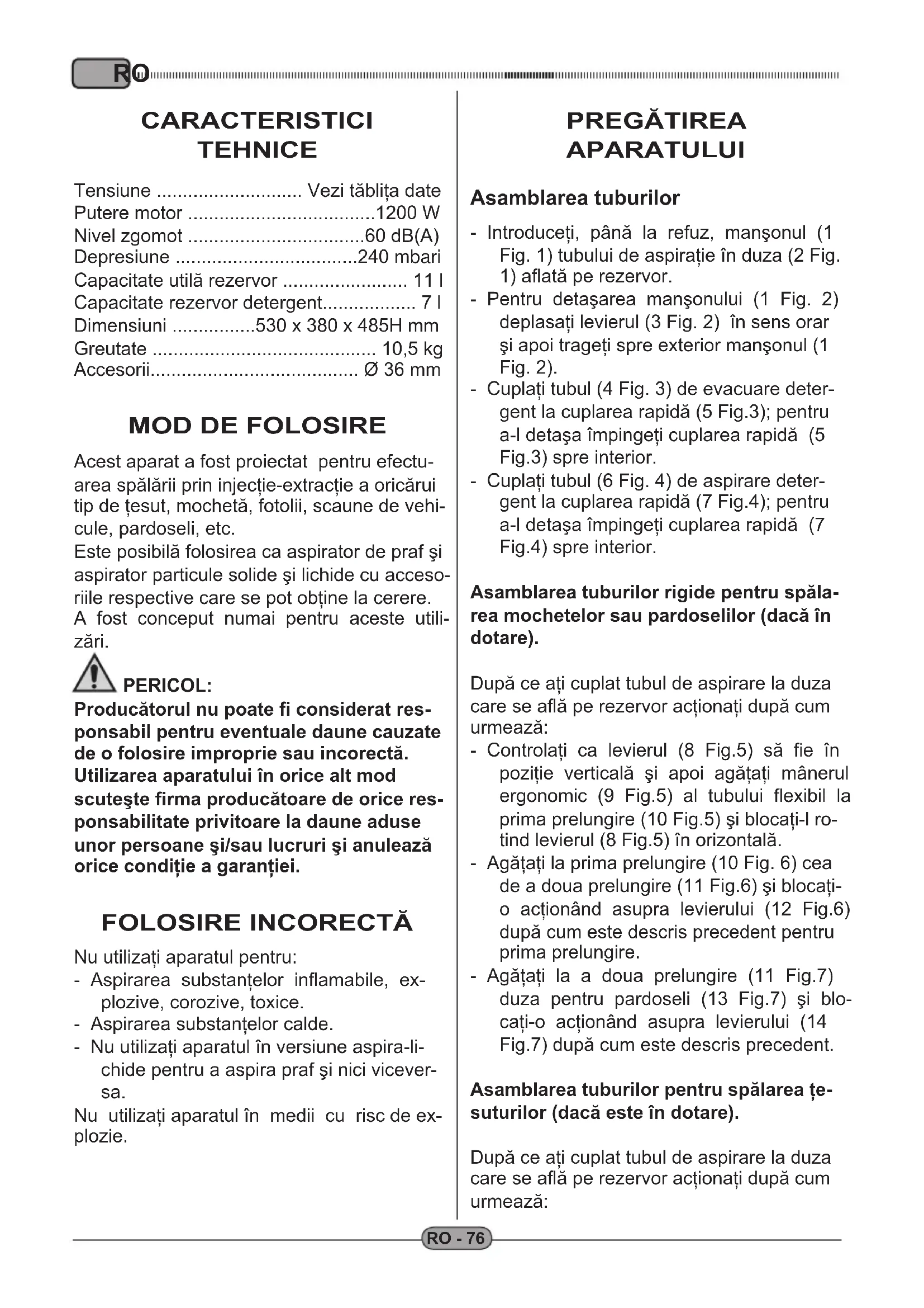 Acest aparat a fost proiectat pentru efectu- area spălării prin injecţie-extracţie a oricărui tip de ţesut, mochetă, fotolii, scaune de vehi- cule, pardoseli, etc. Este posibilă folosirea ca aspirator de praf şi aspirator particule solide şi lichide cu acceso- riile respective care se pot obţine la cerere. A fost conceput numai pentru aceste utili- zări. PERICOL: Producătorul nu poate fi considerat res- ponsabil pentru eventuale daune cauzate de o folosire improprie sau incorectă. Utilizarea aparatului în orice alt mod scuteşte firma producătoare de orice res- ponsabilitate privitoare la daune aduse unor persoane şi/sau lucruri şi anulează orice condiţie a garanţiei. FOLOSIRE INCORECTĂ Nu utilizaţi aparatul pentru: - Aspirarea substanţelor inflamabile, ex- plozive, corozive, toxice. - Aspirarea substanţelor calde. - Nu utilizaţi aparatul în versiune aspira-li- chide pentru a aspira praf şi nici vicever- sa. Nu utilizaţi aparatul în medii cu risc de ex- plozie. PREGĂTIREA APARATULUI Asamblarea tuburilor - Introduceţi, până la refuz, manşonul (1 Fig. 1) tubului de aspiraţie în duza (2 Fig.