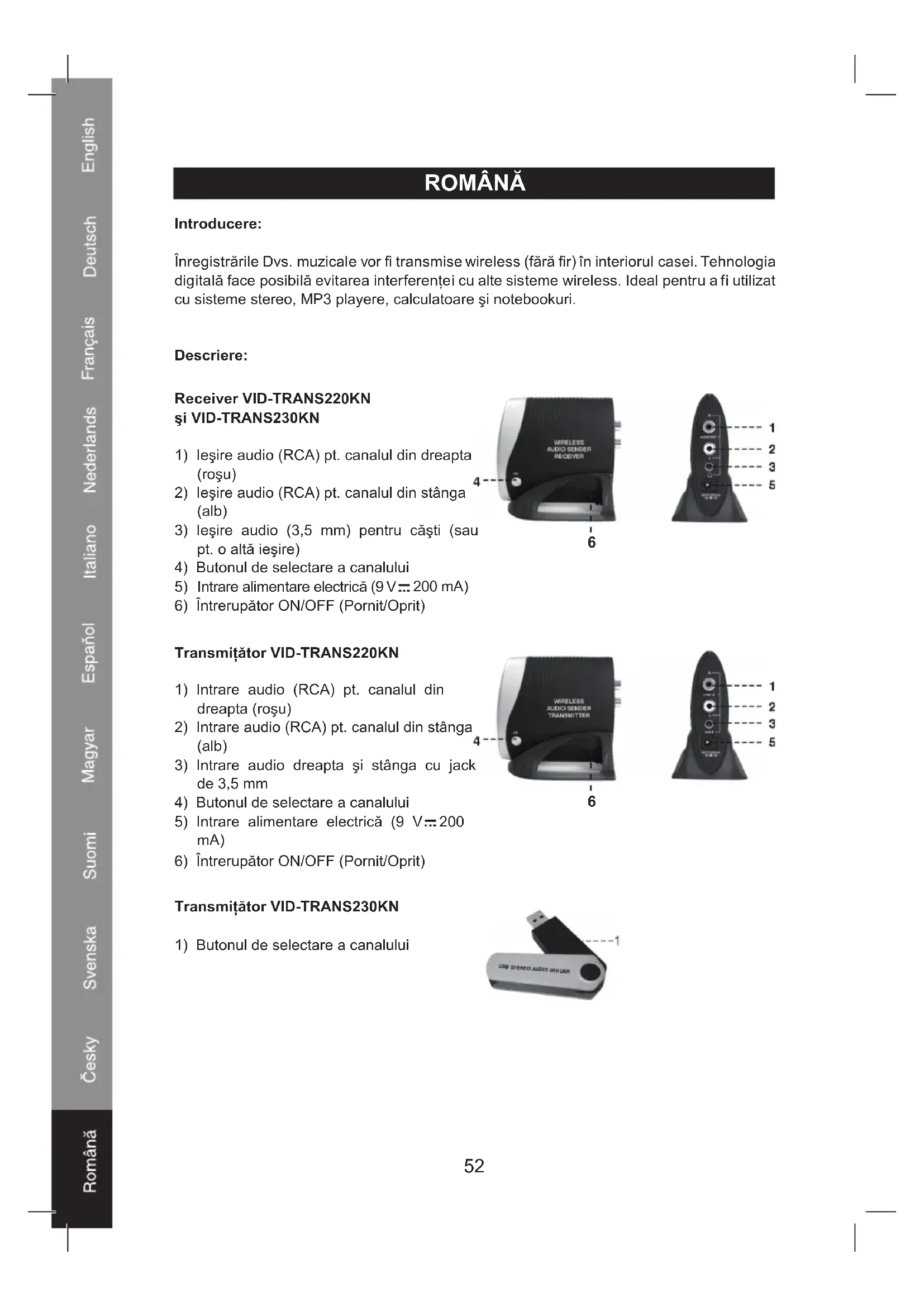 Transmiţător VID-TRANS230KN Conectaţi transmiţătorul USB într-un port USB liber al notebookului sau al PC-ului. Observaţie: În timpul transferului de date LED-ul transmiţătorului (USB) VID-TRANS230KN va pâlpâi. Dacă în timpul transferului de date transmiţătorul este deconectat şi reconectat, există posibilitatea ca softul de muzică instalat pe notebook sau pe PC să trebuiască să fie repornit pentru a putea reîncepe transferul de date. Receiver VID-TRANS220KN şi VID-TRANS230KN