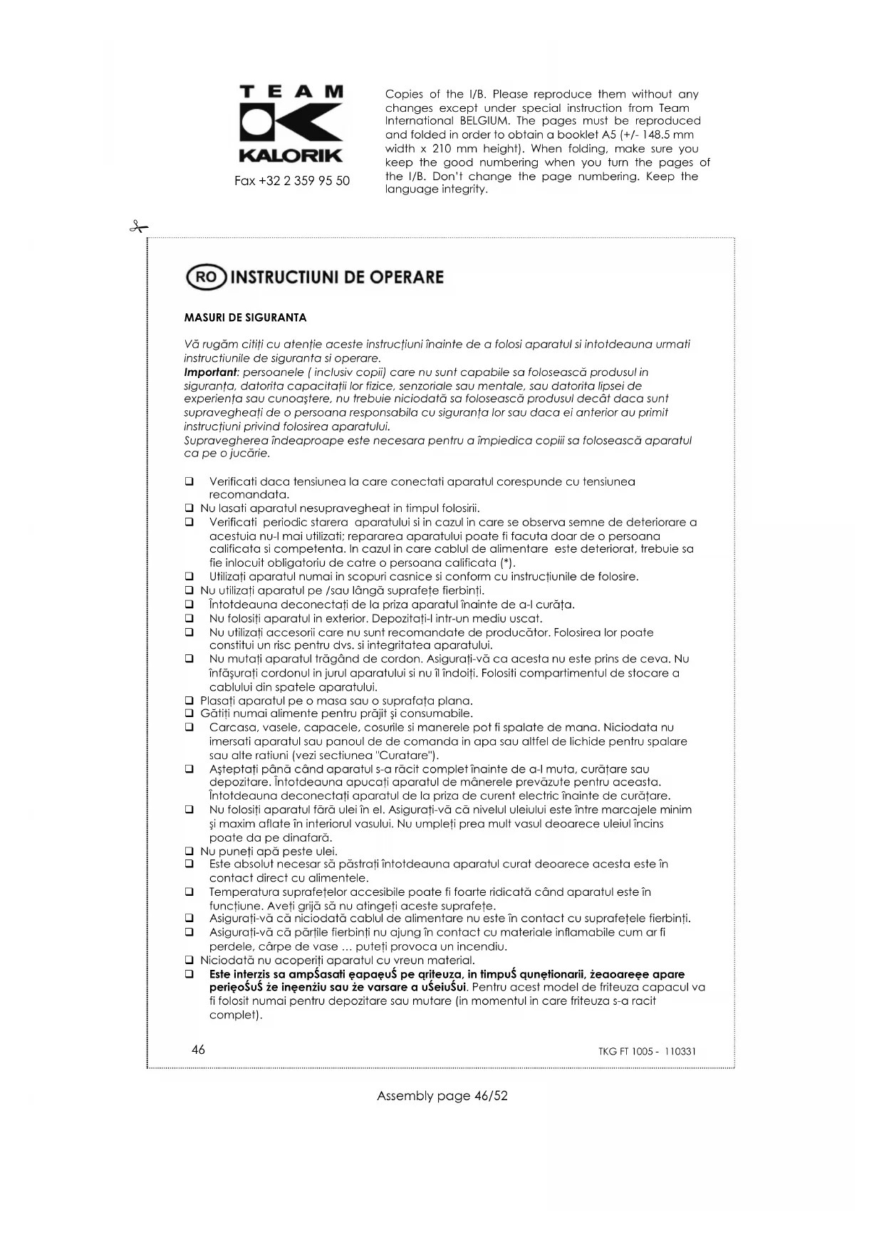 Fax +32 2 359 95 50 ATENŢIE: friteuza poate atinge temperaturi ridicate în timpul folosirii. Uleiul şi grăsimile pot lua foc dacă sunt prea încălzite. Fiţi foarte precauţi nu lăsaţi aparatul în funcţiune pentru perioade lungi. Nu uitaţi să scoateţi aparatul din priză odată ce aţi terminat de preparat mâncarea. Înainte de a scoate aparatul din priză puneţi selectorul de temperatură pe poziţia minimă. Asiguraţi o ventilaţie propice în timpul funcţionării. Atentie: Cand ambele friteuze sunt conectate la priza, curentul consumat este de aproximativ 19,5 A. Ca atare va safatuim sa conectati fiecare unitate a friteuzei la circuite electrice diferite. Inainte de a conecta friteuza la priza asigurati-va ca circuitul electric suporta sarcina mentionata mai sus. Nu conectati niciodata friteuza la un triplu stecher sau prelungitor. Aparatul dvs. nu trebuie sa fie pornit print-un comutator cu ceas sau orice altfel de comutator.
