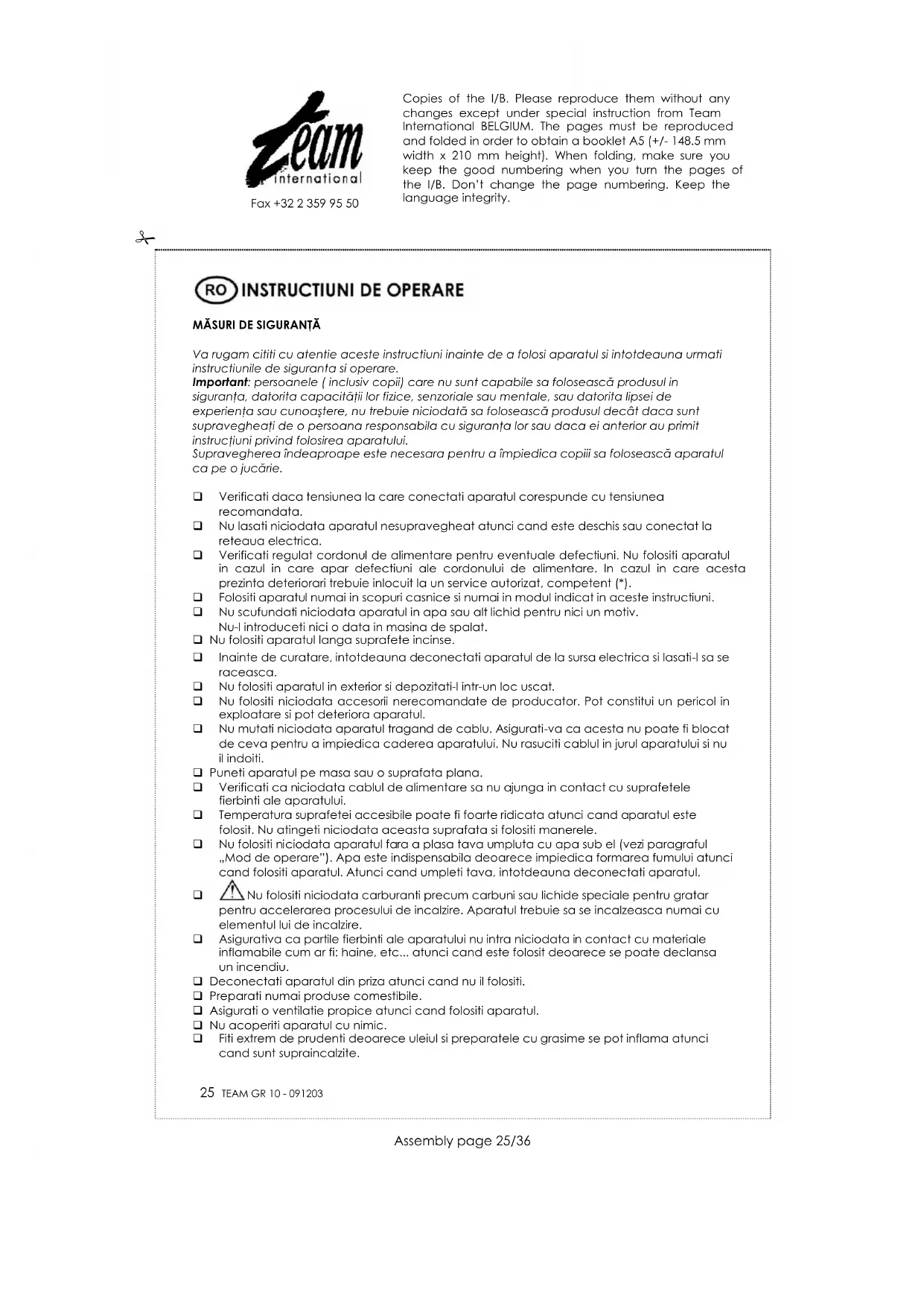 Simbolul de pe tăbliţa cu datele tehnice înseamnă că produsul nu se poate arunca împreună cu alte reziduuri menajere. Legea pedepseşte cu amendă persoanele care aruncă aparatele electrice şi electronice împreună cu alte reziduuri. Debarasarea corespunzătoare a produselor uzate previne formarea unor efecte negative pentru mediul natural şi sănătatea umană, care pot fi produse de manipularea nepotrivită a reziduurilor rămase din uzarea aparatelor electronice. Copies of the I/B. Please reproduce them without any changes except under special instruction from Team International BELGIUM. The pages must be reproduced and folded in order to obtain a booklet A5 (+/- 148.5 mm width x 210 mm height). When folding, make sure you keep the good numbering when you turn the pages of the I/B. Don‟t change the page numbering. Keep the language integrity.
