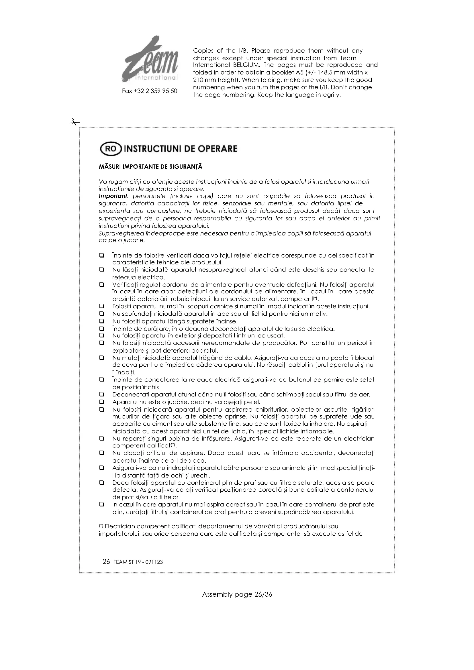 Simbolul de pe tăbliţa cu datele tehnice înseamnă că produsul nu se poate arunca împreună cu alte reziduuri menajere. Legea pedepseşte cu amendă persoanele care aruncă aparatele electrice şi electronice împreună cu alte reziduuri. Debarasarea corespunzătoare a produselor uzate previne formarea unor efecte negative pentru mediul natural şi sănătatea umană, care pot fi produse de manipularea nepotrivită a reziduurilor rămase din uzarea aparatelor electronice. Copies of the I/B. Please reproduce them without any changes except under special instruction from Team International BELGIUM. The pages must be reproduced and folded in order to obtain a booklet A5 (+/- 148.5 mm width x 210 mm height). When folding, make sure you keep the good numbering when you turn the pages of the I/B. Don’t change the page numbering. Keep the language integrity.