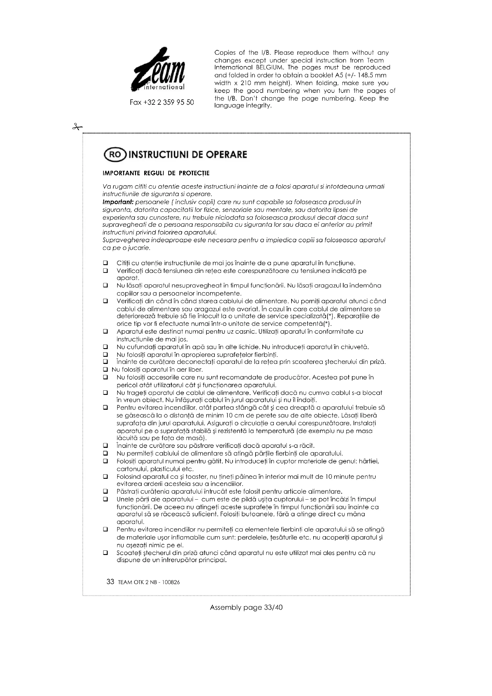 Simbolul de pe tăbliţa cu datele tehnice înseamnă că produsul nu se poate arunca împreună cu alte reziduuri menajere. Legea pedepseşte cu amendă persoanele care aruncă aparatele electrice şi electronice împreună cu alte reziduuri. Debarasarea corespunzătoare a produselor uzate previne formarea unor efecte negative pentru mediul natural şi sănătatea umană, care pot fi produse de manipularea nepotrivită a reziduurilor rămase din uzarea aparatelor electronice. Copies of the I/B. Please reproduce them without any changes except under special instruction from Team International BELGIUM. The pages must be reproduced and folded in order to obtain a booklet A5 (+/- 148.5 mm width x 210 mm height). When folding, make sure you keep the good numbering when you turn the pages of the I/B. Don’t change the page numbering. Keep the language integrity.
