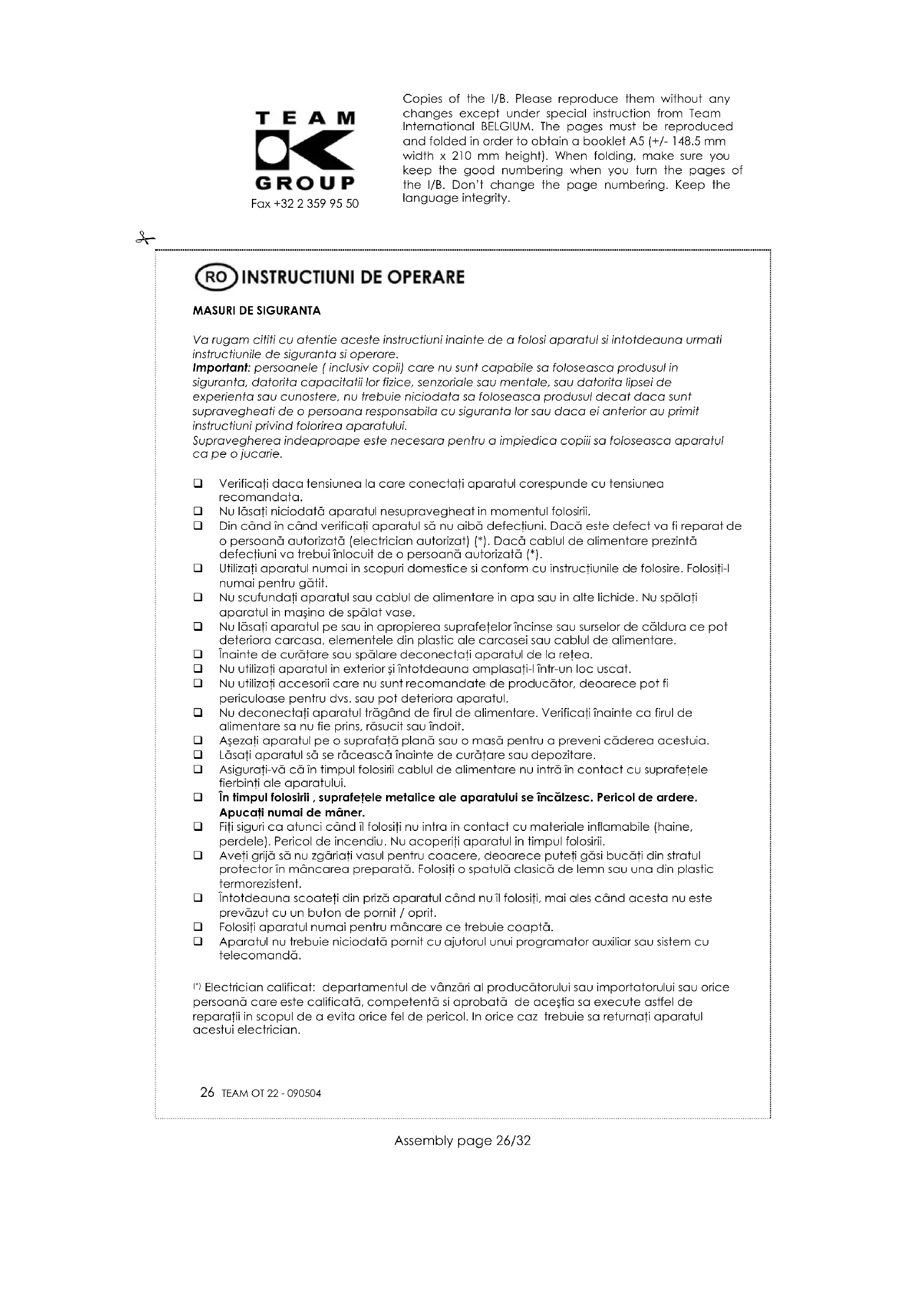 Simbolul de pe tăbliţa cu datele tehnice înseamnă că produsul nu se poate arunca împreună cu alte reziduuri menajere. Legea pedepseşte cu amendă persoanele care aruncă aparatele electrice şi electronice împreună cu alte reziduuri. Debarasarea corespunzătoare a produselor uzate previne formarea unor efecte negative pentru mediul natural şi sănătatea umană, care pot fi produse de manipularea nepotrivită a reziduurilor rămase din uzarea aparatelor electronice. Copies of the I/B. Please reproduce them without any changes except under special instruction from Team International BELGIUM. The pages must be reproduced and folded in order to obtain a booklet A5 (+/- 148.5 mm width x 210 mm height). When folding, make sure you keep the good numbering when you turn the pages of the I/B. Don’t change the page numbering. Keep the language integrity.