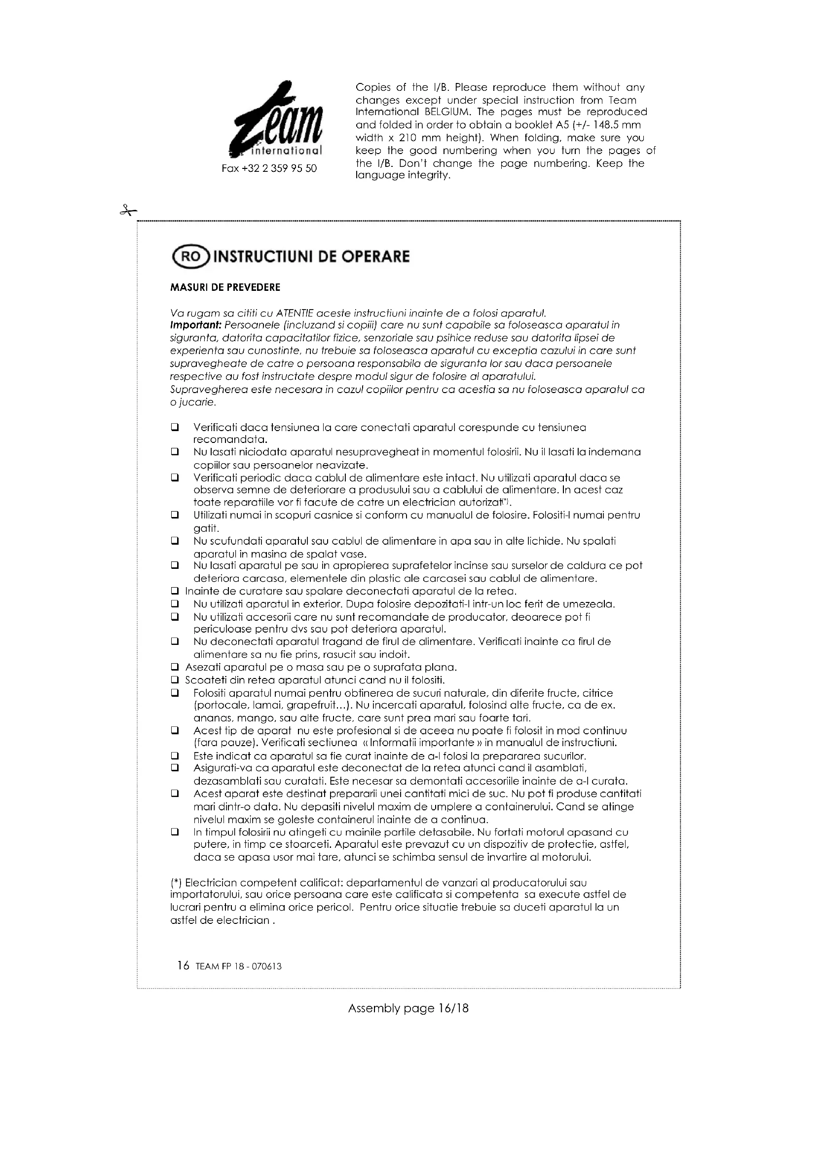 FP 18 - Storcător de fructe TEAM - Manual de utilizare gratuit