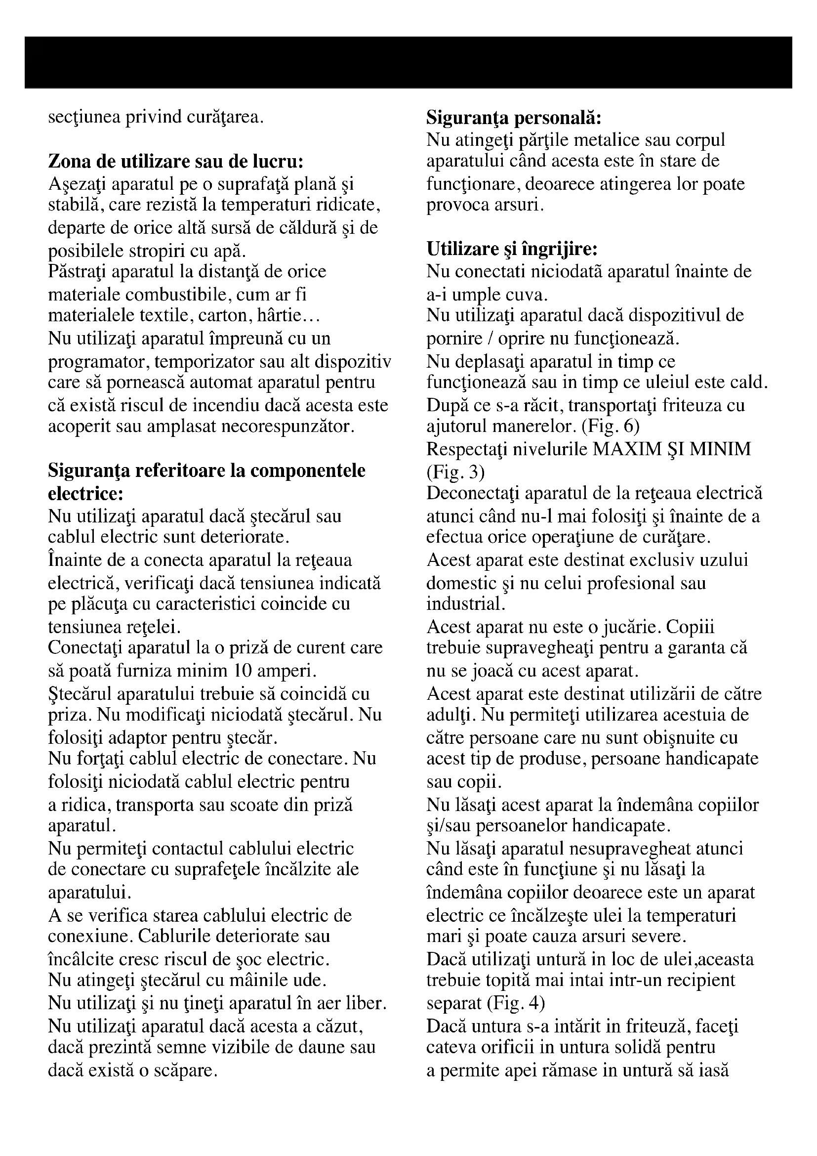 - В соответствии с требованиями по охране окружающей среды упаковка изготовлена из материалов, подлежащих вторичной переработке. Если Вы захотите ее выбросить, то можете воспользоваться специальными контейнерами, предназначенными для каждого типа материала. - Ни сам прибор, ни его упаковка не содержат материалов, представляющих опасность для окружающей среды. Настоящий прибор изготовлен в соответствии с требованиями Директивы 2006/95/EC о Низком напряжении и Директивы 2004/108/EC об Электромагнитной Совместимости электрических приборов. - Данный символ означает, что по окончании полезной жизни прибора не разрешается выбрасывать его в общественный контейнер для мусора. Воспользуйтесь специальными контейнерами или передайте его в руки представителя организации по утилизации и переработке электрических и электронных приборов RAEE (обратитесь за консультацией в ближайший социальный центр).Română Friteuză STAR 3 FUTURA 2 Stimate client, Va multumim ca ati ales un produs electrocasnic marca TAURUS. Designul, performantele si tehnologia acestui aparat, cat si controalele stricte in ceea ce priveste calitatea in timpul procesului de fabricatie, va vor furniza satisfactii depline pentru multi ani. Descrierea A Capac B Mâner capac C Termostat de reglare a temperaturii D Indicator luminos E Întrerupător automat de siguranţă F Indicatoare de ghidare G Unitate de control H Element încălzitor I Coş pentru prăjire J Suport pentru coş K Mâner al coşului L Cuvă M Indicatoare de nivel N Cuvã O Buton de rearmare P Locaş conexiune reţea Q Cablu electric R Suport Unitate de Control Sfaturisiavertizãriprivind sigurant Cititi cu atentie acest manual de instructiuni înainte de a pune aparatul în functiune si pãstrati-l pentru consulte ulterioare. Necitirea şi nerespectarea acestor instrucţiuni pot avea ca rezultat un accident. Înainte de prima utilizare a produsului, se vor curăţa părţile care intră în contact cu alimentele conform instrucţiunilor din Изделия марки TAURUS соответствуют всем требуемым европейским и российским стандартам безопасности и гигиены. В соответствии с законом РФ «О Защите Прав Потребителей», срок службы на продукцию TAURUS устанавливается равным трем годам с момента приобретения. При бережном использовании и соблюдении правил эксплуатации, изделия могут иметь значительно больший срок службы, чем установленный в соответствии с Российским законодательством.secţiunea privind curăţarea. Zonadeutilizaresaudelucru: Aşezaţi aparatul pe o suprafaţă plană şi stabilă, care rezistă la temperaturi ridicate, departe de orice altă sursă de căldură şi de posibilele stropiri cu apă. Păstraţi aparatul la distanţă de orice materiale combustibile, cum ar fi materialele textile, carton, hârtie… Nu utilizaţi aparatul împreună cu un programator, temporizator sau alt dispozitiv care să pornească automat aparatul pentru că există riscul de incendiu dacă acesta este acoperit sau amplasat necorespunzător. Siguranţareferitoarelacomponentele electrice: Nu utilizaţi aparatul dacă ştecărul sau cablul electric sunt deteriorate. Înainte de a conecta aparatul la reţeaua electrică, verificaţi dacă tensiunea indicată pe plăcuţa cu caracteristici coincide cu tensiunea reţelei. Conectaţi aparatul la o priză de curent care să poată furniza minim 10 amperi. Ştecărul aparatului trebuie să coincidă cu priza. Nu modificaţi niciodată ştecărul. Nu folosiţi adaptor pentru ştecăr. Nu forţaţi cablul electric de conectare. Nu folosiţi niciodată cablul electric pentru a ridica, transporta sau scoate din priză aparatul. Nu permiteţi contactul cablului electric de conectare cu suprafeţele încălzite ale aparatului. A se verifica starea cablului electric de conexiune. Cablurile deteriorate sau încâlcite cresc riscul de şoc electric. Nu atingeţi ştecărul cu mâinile ude. Nu utilizaţi şi nu ţineţi aparatul în aer liber. Nu utilizaţi aparatul dacă acesta a căzut, dacă prezintă semne vizibile de daune sau dacă există o scăpare. Siguranţapersonală: Nu atingeţi părţile metalice sau corpul aparatului când acesta este în stare de funcţionare, deoarece atingerea lor poate provoca arsuri. Utilizareşiîngrijire: Nu conectati niciodatã aparatul înainte de a-i umple cuva. Nu utilizaţi aparatul dacă dispozitivul de pornire / oprire nu funcţionează. Nu deplasaţi aparatul in timp ce funcţionează sau in timp ce uleiul este cald. După ce s-a răcit, transportaţi friteuza cu ajutorul manerelor. (Fig. 6) Respectaţi nivelurile MAXIM ŞI MINIM (Fig. 3) Deconectaţi aparatul de la reţeaua electrică atunci când nu-l mai folosiţi şi înainte de a efectua orice operaţiune de curăţare. Acest aparat este destinat exclusiv uzului domestic şi nu celui profesional sau industrial. Acest aparat nu este o jucărie. Copiii trebuie sup