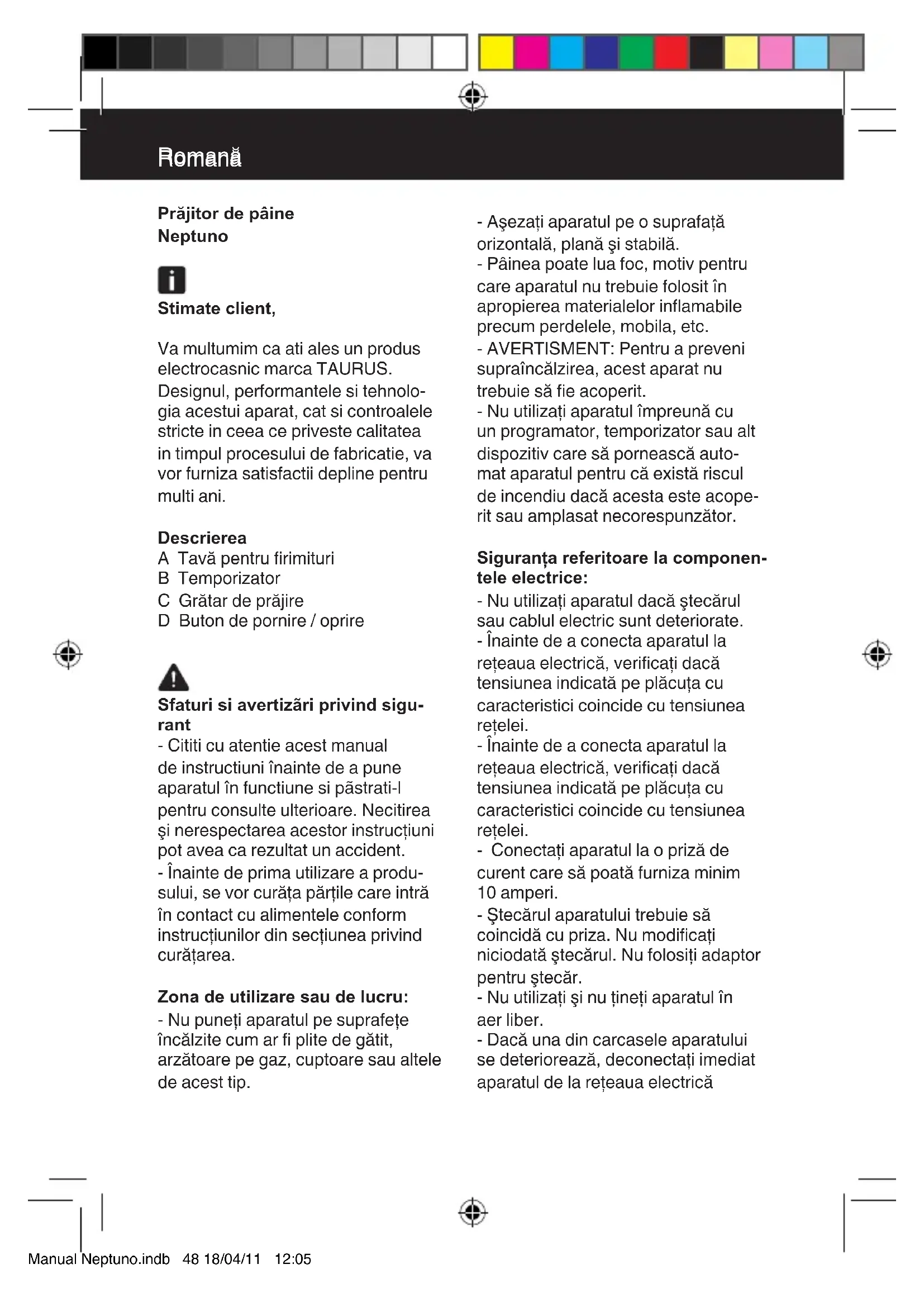 - Ни сам прибор, ни его упаковка не содержат веществ, представляющих опасность для окружающе среды. - Прибор содержит или может содержать масло. Помните, что необходимо соблюдать существующие нормативы по удалению данного типа загрязняющих веществ. Данны символ означает, что по окончании полезно жизни прибора следует передать его в пункт приема отслуживших электрических и электронных приборов (RAEE) или в руки представителя соответствующе организации. Прибор изготовлен в соответствии с требованиями Директивы 2006/95/EC о низком напряжении и Директивы 2004/108/EC об электромагнитно совместимости электрических приборов. Manual Neptuno.indb 47 18/04/11 12:05Romană Prăjitor de pâine Neptuno Stimate client, Va multumim ca ati ales un produs electrocasnic marca TAURUS. Designul, performantele si tehnolo- gia acestui aparat, cat si controalele stricte in ceea ce priveste calitatea in timpul procesului de fabricatie, va vor furniza satisfactii depline pentru multi ani. Descrierea A Tavă pentru rimituri B Temporizator C Grătar de prăjire D Buton de pornire / oprire Sfaturi si avertizãri privind sigu- rant - Cititi cu atentie acest manual de instructiuni înainte de a pune aparatul în functiune si pãstrati-l pentru consulte ulterioare. Necitirea şi nerespectarea acestor instrucţiuni pot avea ca rezultat un accident. - Înainte de prima utilizare a produ- sului, se vor curăţa părţile care intră în contact cu alimentele conform instrucţiunilor din secţiunea privind curăţarea. Zona de utilizare sau de lucru: - Nu puneţi aparatul pe suprafeţe încălzite cum ar plite de gătit, arzătoare pe gaz, cuptoare sau altele de acest tip. - Aşezaţi aparatul pe o suprafaţă orizontală, plană şi stabilă. - Pâinea poate lua foc, motiv pentru care aparatul nu trebuie folosit în apropierea materialelor inamabile precum perdelele, mobila, etc. - AVERTISMENT: Pentru a preveni supraîncălzirea, acest aparat nu trebuie să e acoperit. - Nu utilizaţi aparatul împreună cu un programator, temporizator sau alt dispozitiv care să pornească auto- mat aparatul pentru că există riscul de incendiu dacă acesta este acope- rit sau amplasat necorespunzător. Siguranţa referitoare la componen- tele electrice: - Nu utilizaţi aparatul dacă ştecărul sau cablul electric sunt deteriorate. - Înainte de a conecta aparatul la reţeaua electrică, vericaţi dacă tensiunea indicată pe plăcuţa cu caracteristici coincide cu tensiunea reţelei. - Înainte de a conecta aparatul la reţeaua electrică, vericaţi dacă tensiunea indicată pe plăcuţa cu caracteristici coincide cu tensiunea reţelei. - Conectaţi aparatul la o priză de curent care să poată furniza minim 10 amperi. - Ştecărul aparatului trebuie să coincidă cu priza. Nu modicaţi niciodată ştecărul. Nu folosiţi adaptor pentru ştecăr. - Nu utilizaţi şi nu ţineţi aparatul în aer liber. - Dacă una din carcasele aparatului se deteriorează, deconectaţi imediat aparatul de la reţeaua electrică Romană Manual Neptuno.indb 48 18/04/11 12:05pentru a evita posibilitatea unei electrocutări. - Nu utilizaţi aparatul dacă acesta a căzut, dacă prezintă semne vizibile de daune sau dacă există o scăpare. - Nu forţaţi cablul electric de co- nectare. Nu folosiţi niciodată cablul electric pentru a ridica, transporta sau scoate din priză aparatul. - Nu înfăşuraţi cablul electric de conectare în jurul aparatului. - Nu permiteţi contactul cablului electric de conectare cu suprafeţele încălzite ale aparatului. - A se verica starea cablului electric de conexiune. Cablurile deteriorate sau încâlcite cresc riscul de şoc electric. - Nu atingeţi ştecărul cu mâinile ude. Siguranţa personală: - Temperatura suprafeţelor acce- sibile poate ridicată atunci când aparatul funcţionează. Utilizare şi îngrijire: - Nu utilizaţi aparatul dacă dispozitivul de pornire / oprire nu funcţionează. - Nu mişcaţi aparatul în timpul utilizǎrii. - Deconectaţi aparatul de la reţeaua electrică atunci când nu-l mai folosiţi şi înainte de a efectua orice operaţiune de curăţare. - Acest aparat este destinat exclusiv uzului domestic şi nu celui profesio- nal sau industrial. - Acest aparat nu este o jucărie. Copiii trebuie supravegheaţi pentru a garanta că nu se joacă cu acest aparat. - Acest aparat este destinat utilizării de către adulţi. Nu permiteţi utilizarea acestuia de către persoane care nu sunt obişnuite cu acest tip de produ- se, persoane handicapate sau copii. - Nu lăsaţi acest aparat la îndemâna copiilor şi/sau persoanelor handi- capate. - Nu puneţi la loc aparatul dacă încă este cald. - Utilizaţi întotdeauna aparatul cu atenţie. - Orice utilizare incorectã sau în de- zacord cu instructiunile de folosire, anuleazã garantia si responsabilita- tea fabricantului. Mod de utilizare Observaţii înainte de utilizare: - Asiguraţi-vă că s-a retras tot mate- rialul de ambalaj al produsului. - Înainte de a folosi aparatul pentru prima oară, vă recomandăm să-l utilizaţi fără pâine. - Câteva părţi ale erului de călcat au fost gresate uşor şi în consecinţă erul poate scoate puţin fum atunci când este deschis prima dată. După puţin timp, fumul va dispărea. Utilizare: - Desfăşuraţi complet cablul înainte de a porni aparatul. - Conectaţi aparatul la reţeaua electrică. - Introduceţi felia / feliile de pâine în aparat. - Selecţionaţi gradul de prăjire cu 